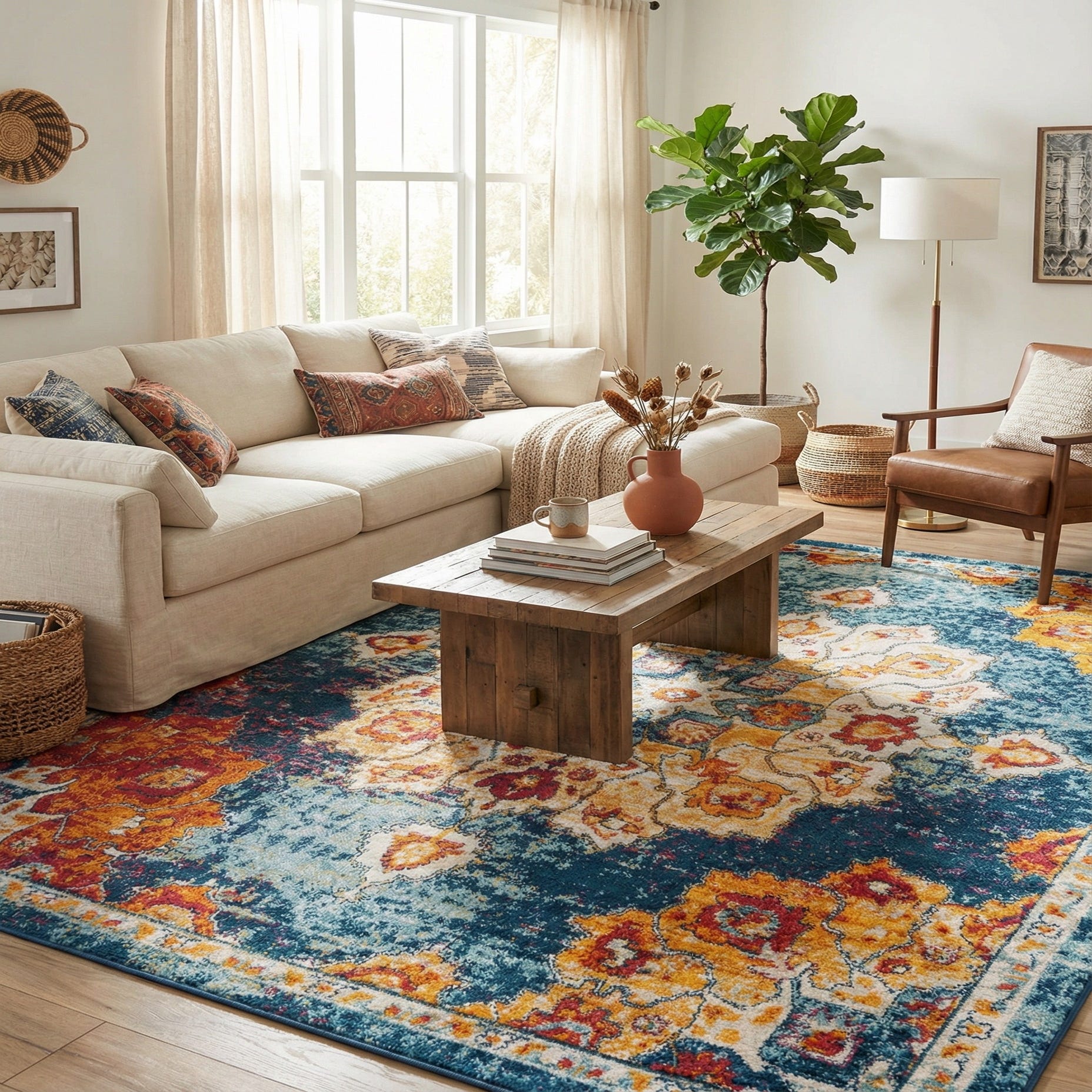 Machine-made from 100% polypropylene, the surface has a low-to-medium pile with a soft hand that feels pleasant underfoot. Use it to anchor a living room seating group or place it beneath a bed to introduce color and pattern to the bedroom; it also works well layered under a dining table when proportion allows. Pair with warm wood furniture and neutral upholstery for a grounded palette, or offset the blues and oranges with brass accents and textured textiles for a more eclectic or global-inspired scheme.