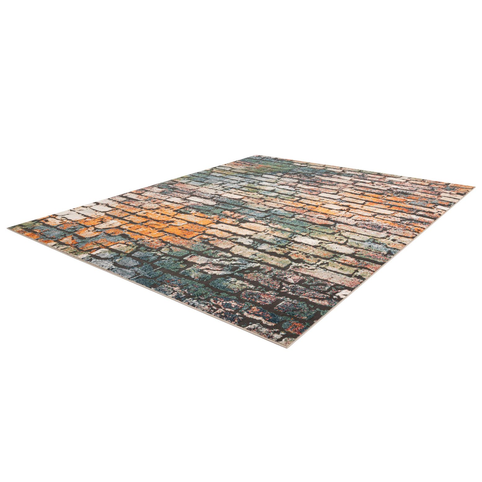 A rectangular 8x10 multi-colored rug featuring a distressed brick wall pattern with shades of orange, green, grey, and cream.