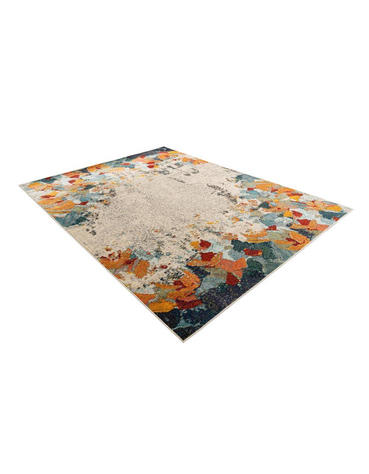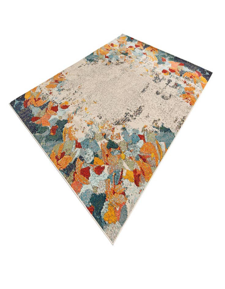 The rug features a stunning array of colors including black, blue, gold, gray, green, ivory, orange, red, and violet which form an abstract pattern reminiscent of a painterly canvas. Its design suggests an amalgamation of blossoms and splashes of paint, creating a lively and uplifting atmosphere in any room.