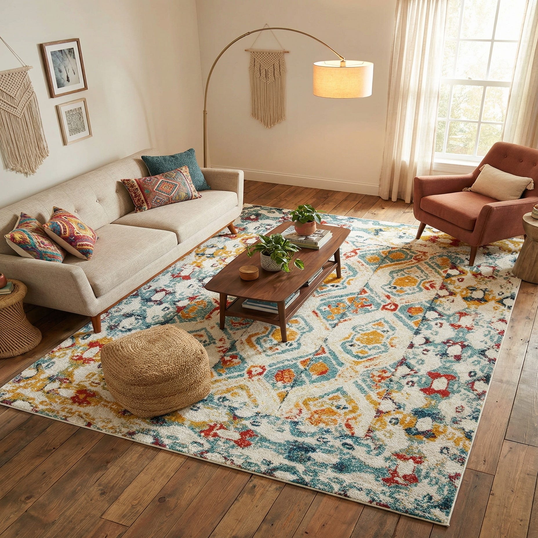 This colorway and pattern work well in a variety of interiors: pair it with a neutral sofa and warm wood tones for a casual, contemporary living room, place it beneath a dining table to introduce color without overwhelming the space, or add it to a layered bedroom floor with tonal linens and black metal accents. The mix of blue, gold and red offers a versatile palette that complements mid-century, transitional, and global-inspired decor.