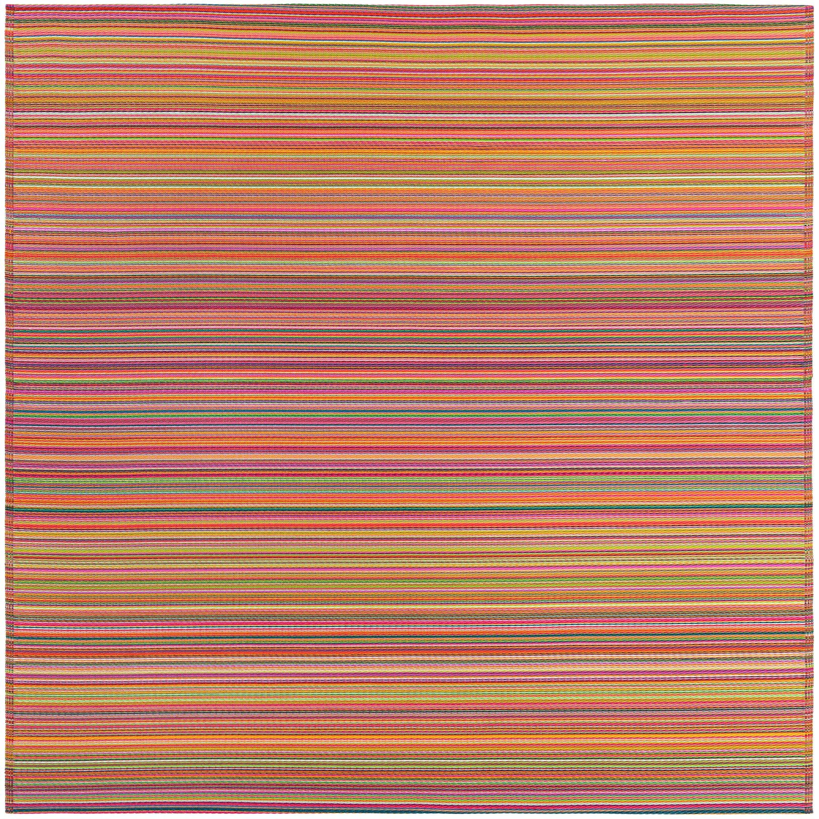 A lively striped design runs across a multi background, stacking fine horizontal bands of orange, yellow and pink with cooler notes of blue, navy and purple and crisp ivory highlights. The pattern reads modern and relaxed — linear and rhythmic without feeling fussy — making a bold, colorful foundation for both indoor and outdoor spaces.