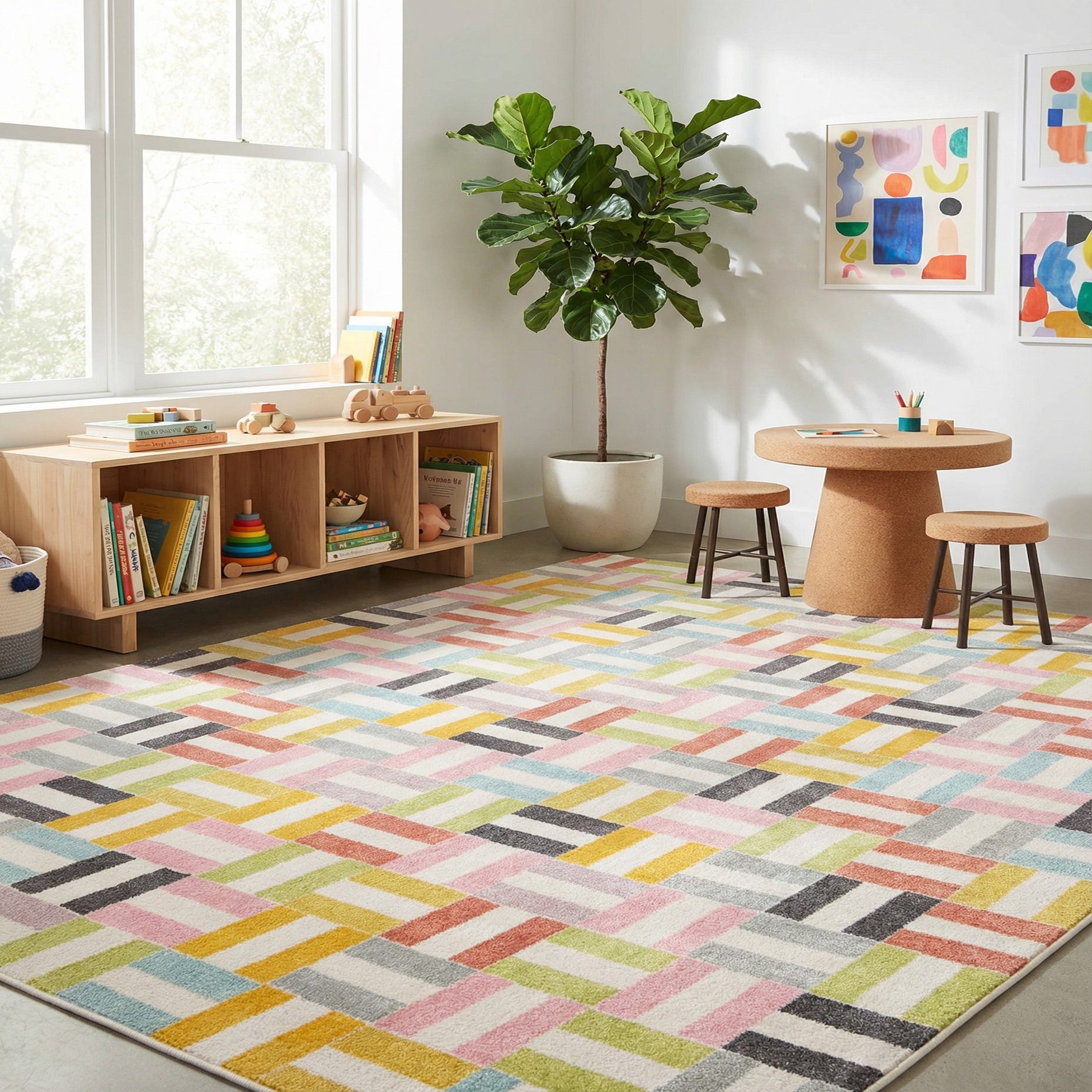 A mosaic of small rectangular tiles creates a playful, basket-weave pattern across a multi background. Each tile alternates short bands of color—black, gray, green, ivory, light blue, red, pink, and violet—laid out in a regular grid that gives the rug a lively, modern look without feeling busy. The repeated striped blocks read as both geometric and whimsical, making the pattern a good fit for contemporary or youth-focused interiors.