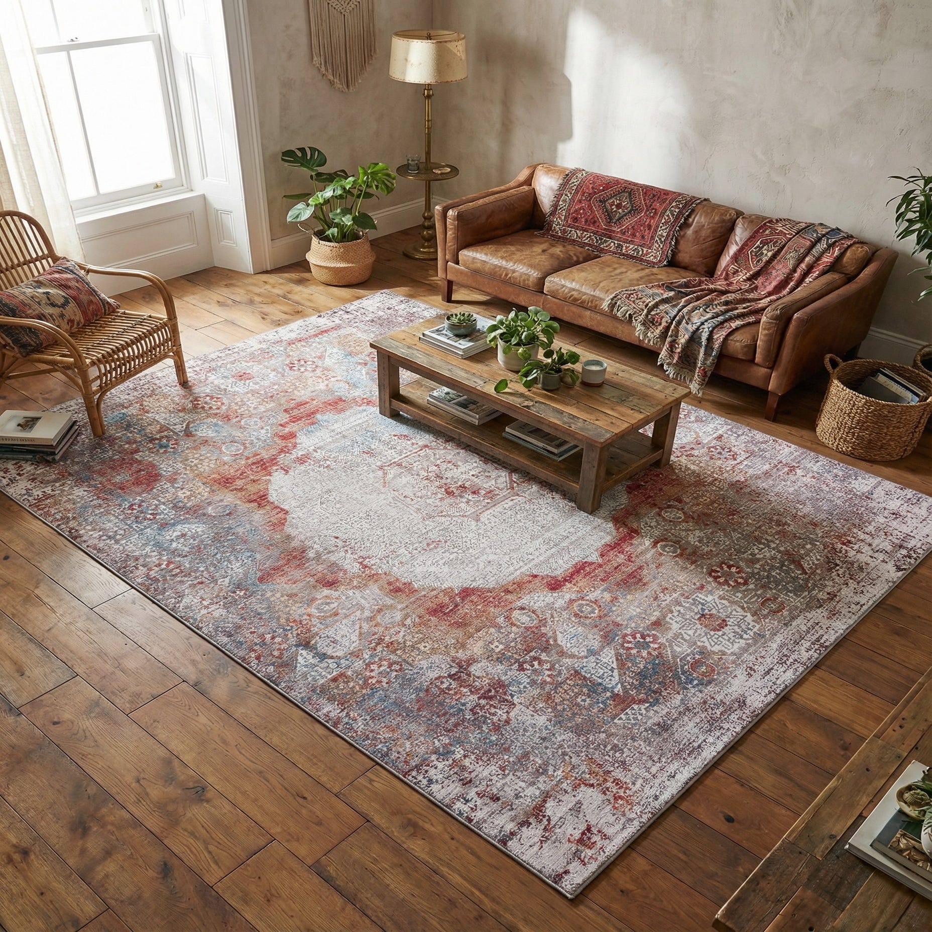 Place this rug beneath a neutral sofa to introduce color without overwhelming the room, or tuck it under a bed to add subtle pattern and warmth to a bedroom. It also pairs well with natural wood finishes, matte metals, and layered textiles in a transitional, modern farmhouse, or bohemian-styled space where an inviting, lived-in look is desired.