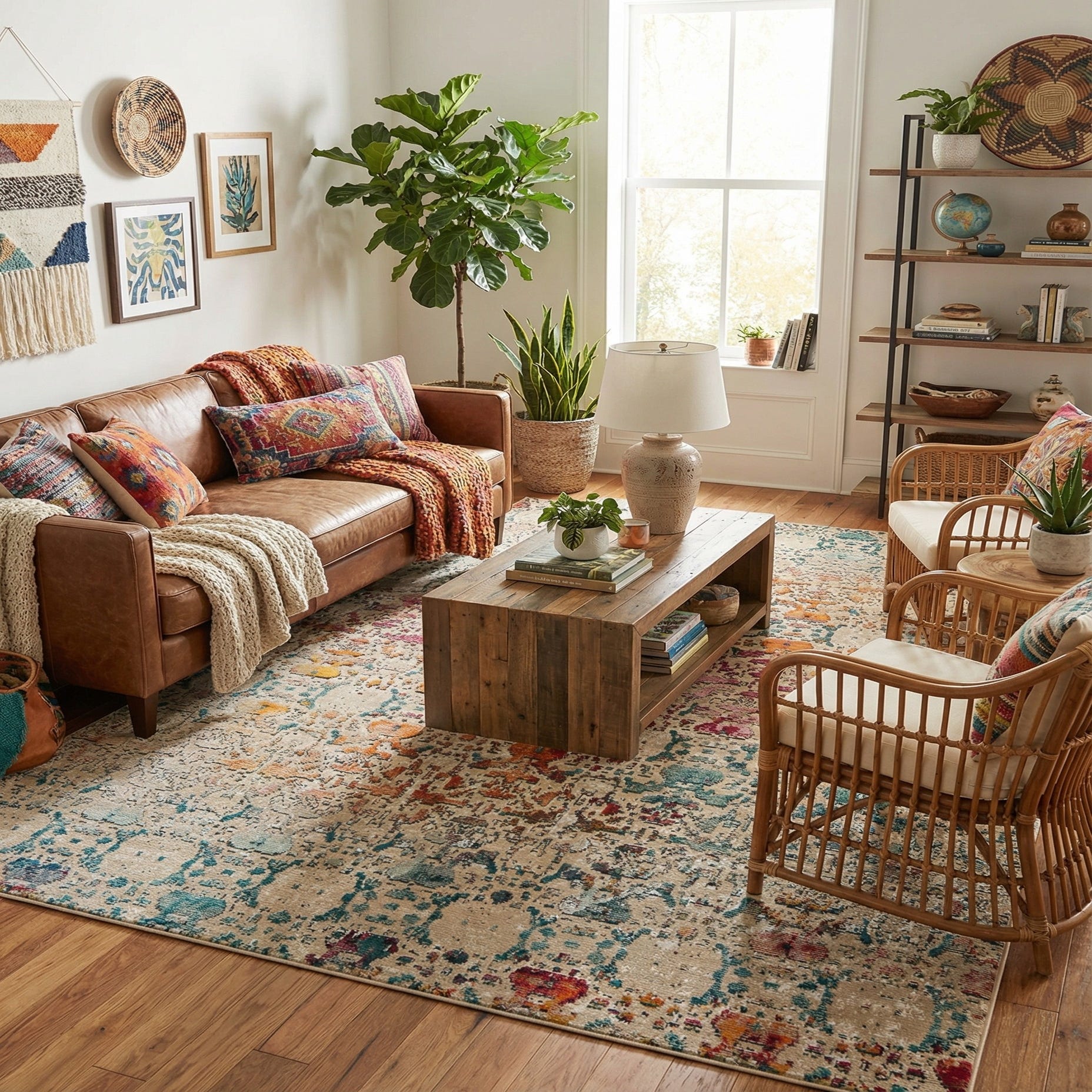 Machine made from 100% polypropylene, the rug has a low, tightly looped pile that feels firm and supportive underfoot and lays flat in active rooms. The color range and vintage-modern pattern suit contemporary, transitional and bohemian interiors — place it beneath a neutral sectional to anchor a living space, under a dining table to introduce layered color, or in a home office to add personality without distraction. Pair with warm wood tones, ivory upholstery and mixed-metal accents for a balanced look, or combine with patterned pillows and textured throws for a more eclectic approach.