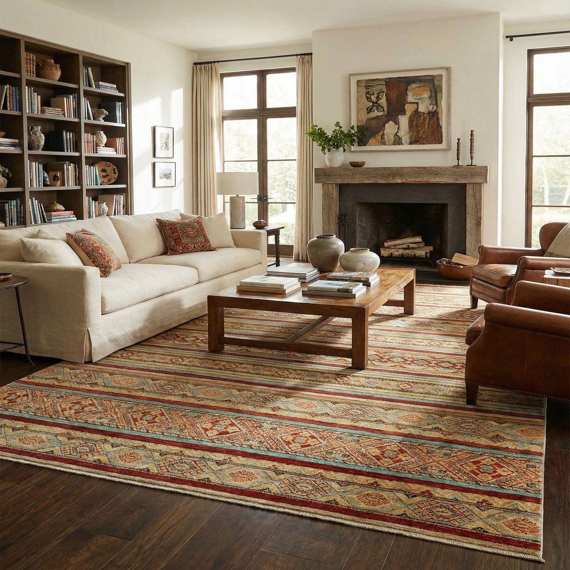 A rectangular 8x11 multi-colored tribal rug with horizontal stripes and geometric patterns, ideal for a living room.