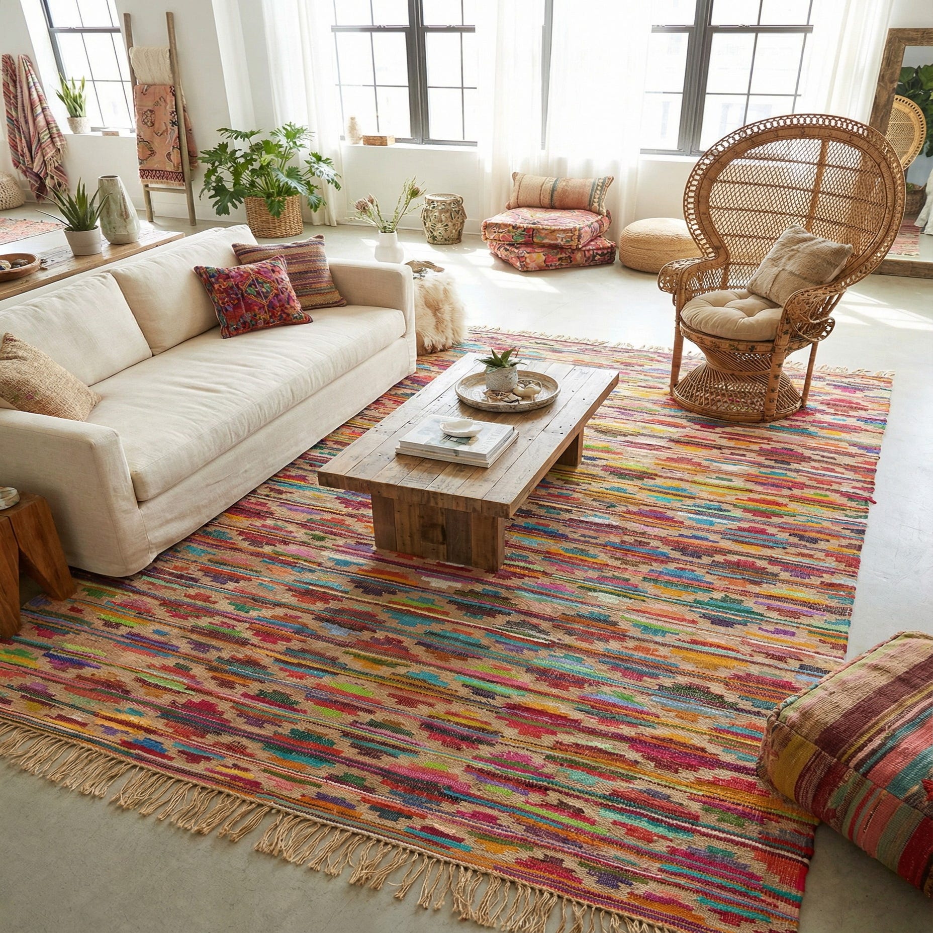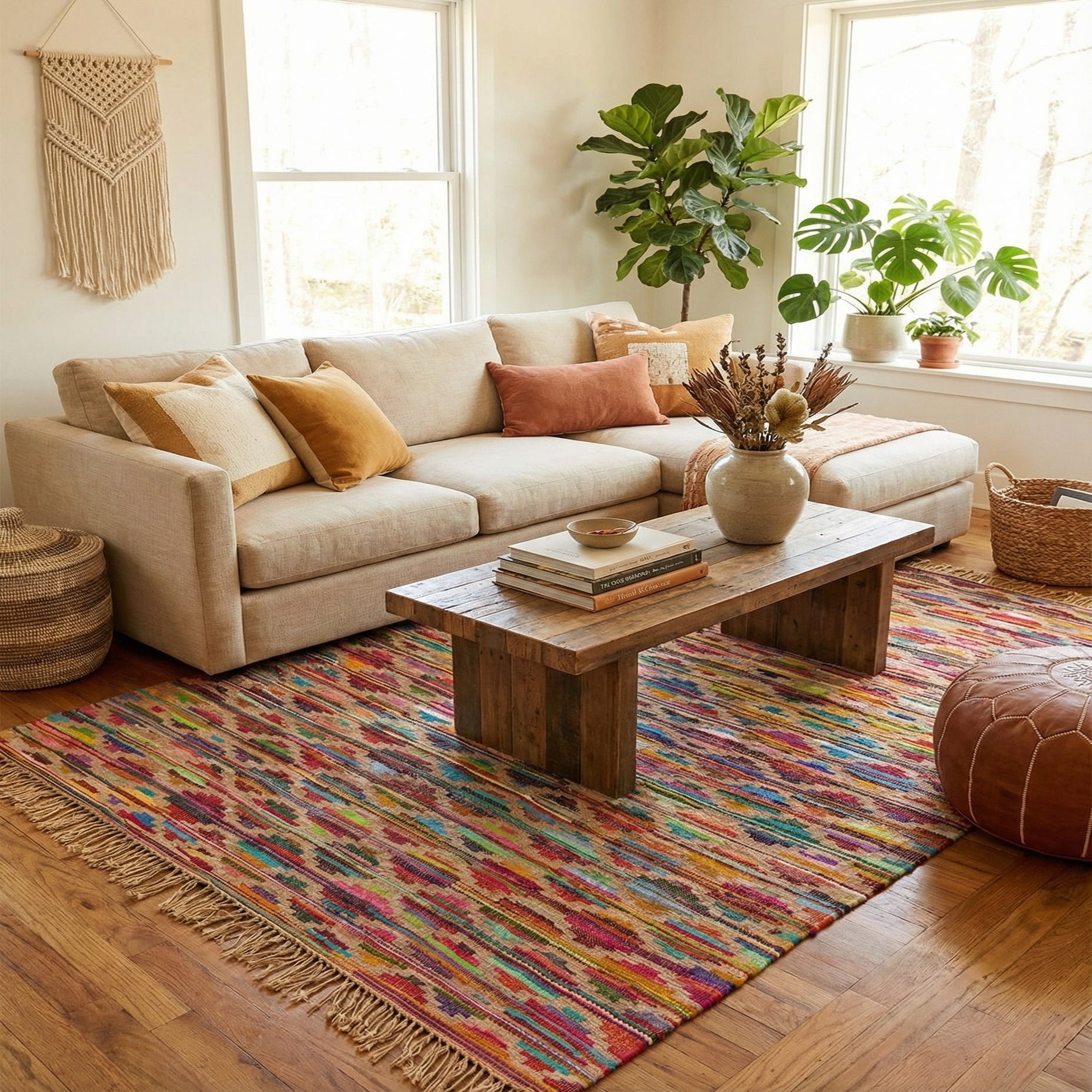 This rug fits well in casual and eclectic interiors: place it under a natural-wood coffee table to warm a living room, layer it in a bedroom to introduce color and pattern, or position it in an entry or sunroom where the multi-hued design can anchor varied furnishings. It also pairs nicely with neutral sofas and woven accents for a balanced look, or with colorful textiles and art when you want to lean into a bohemian or globally inspired scheme.