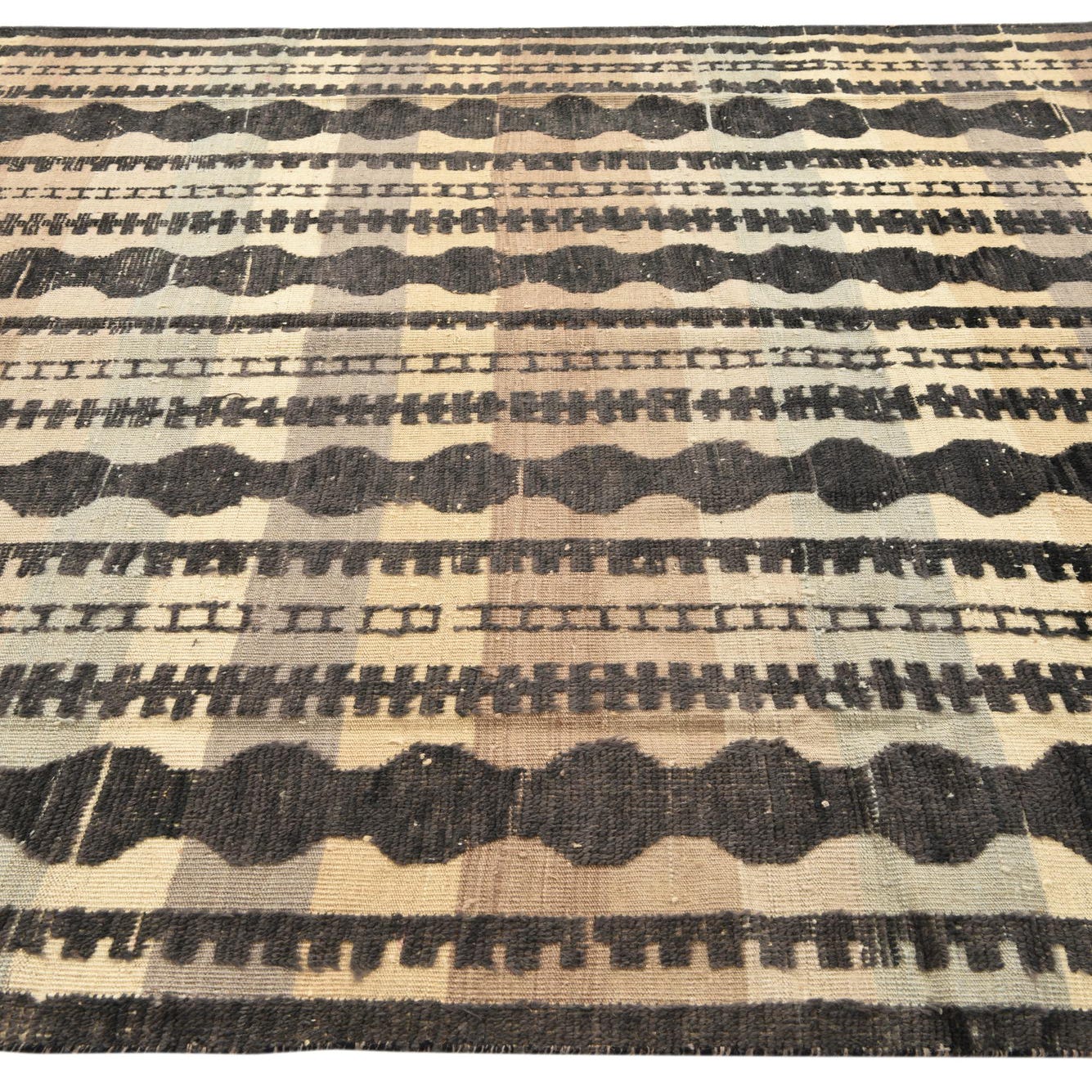 A rectangular 8x11 Darya rug with a modern abstract pattern in multi-colored wool, featuring vertical stripes of black, beige, and light blue.