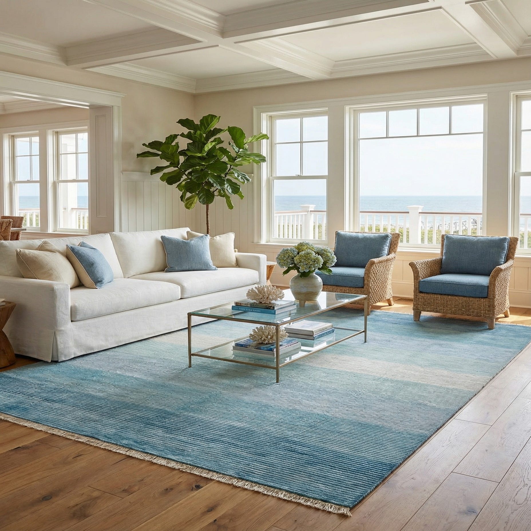The subtle yet compelling pattern of this rug makes it suitable for various interior design scenarios. Its calming color palette would complement a coastal-inspired decor, aligning with the tranquil vibes of seaside themes. Alternatively, the piece is equally poised to anchor a minimalist contemporary space, where its simple design can serve as a foundational element without overpowering the room. The serene hues also work well in a Scandinavian-style setting, where clean lines and light colors are predominant.