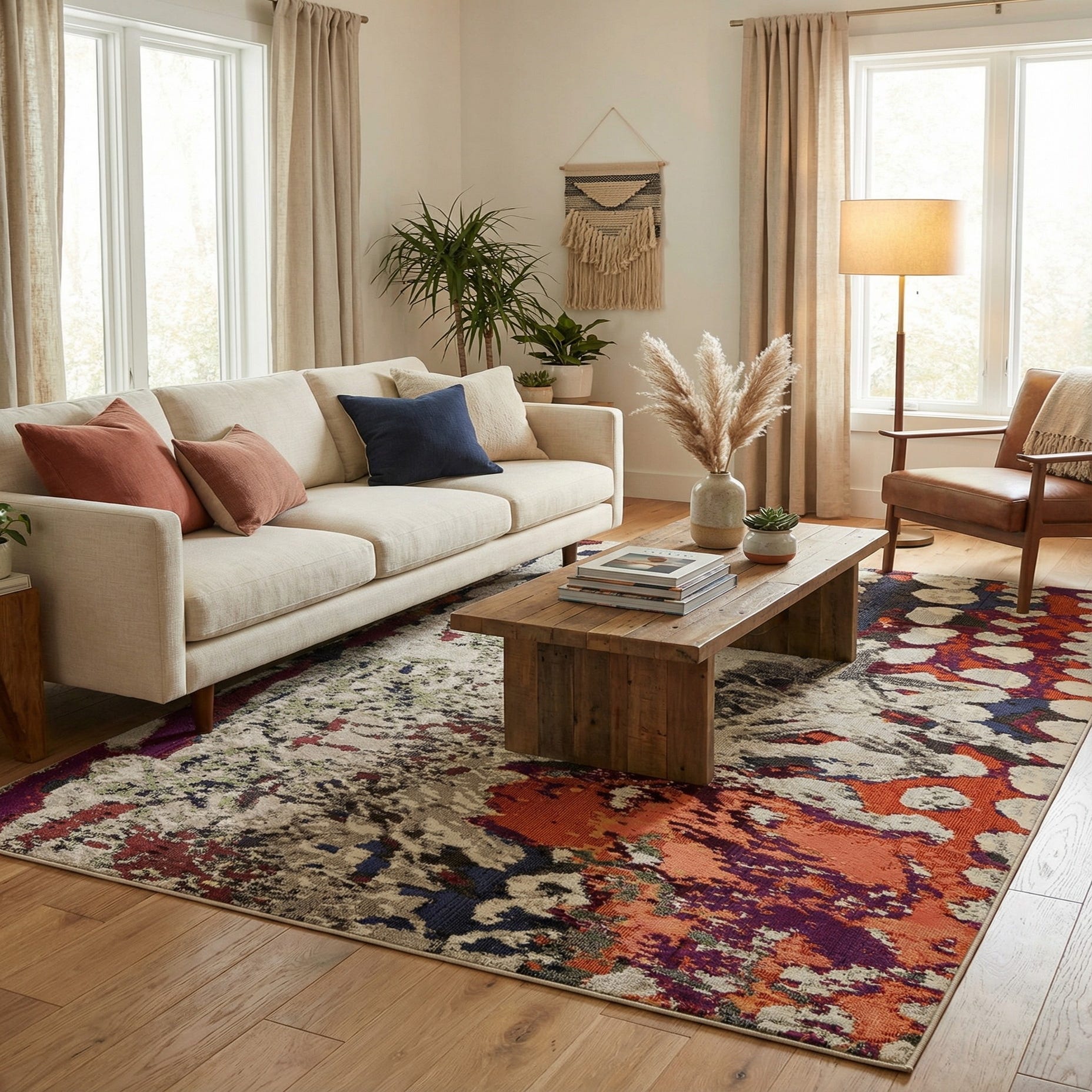 A vibrant 8x11 multi-colored abstract rug with bold splashes of orange, blue, red, and beige, perfect for a modern living room.