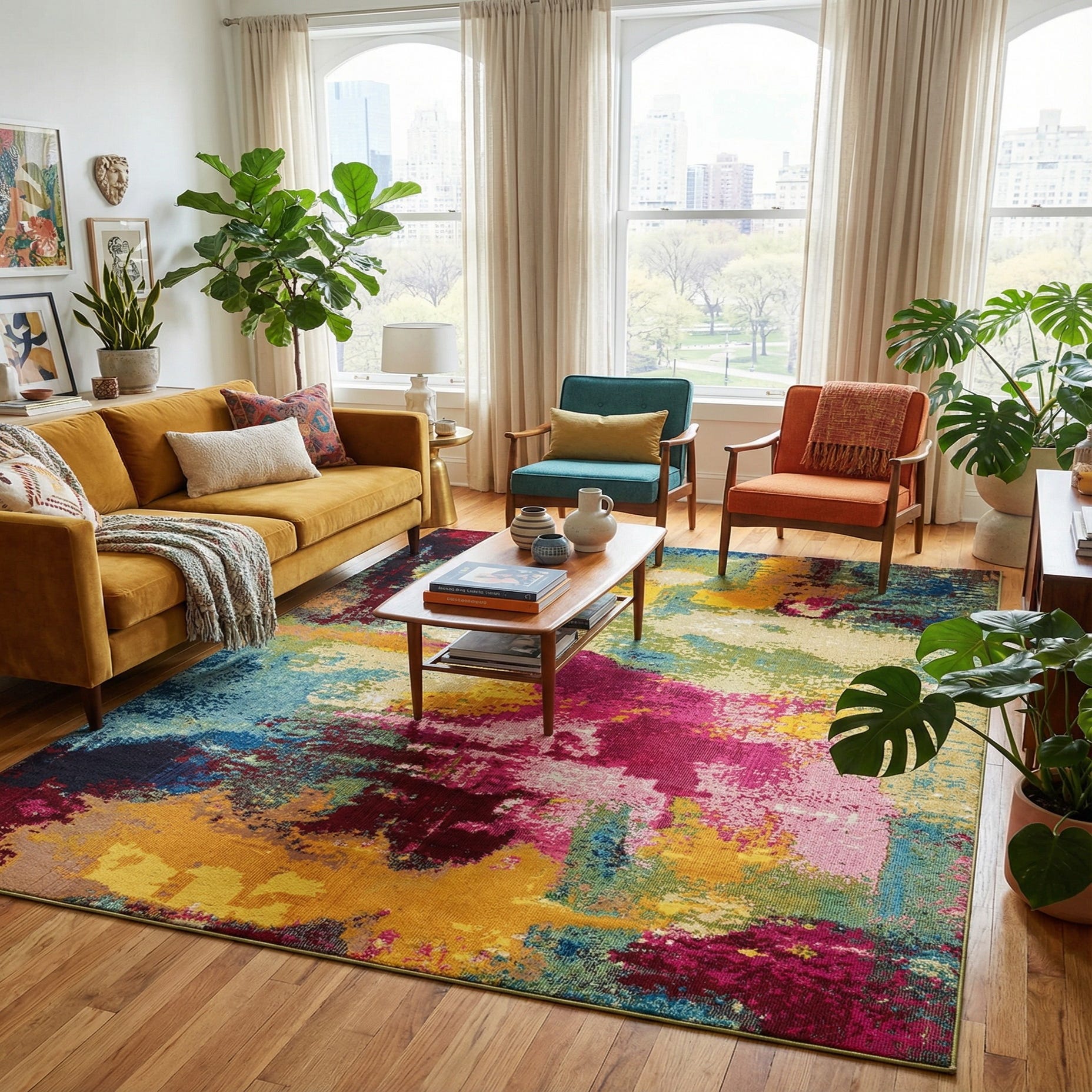Machine made of 100% polypropylene, this rug has a low-profile, tightly woven pile that feels smooth underfoot and maintains the clarity of its printed colors. Place it beneath a living-room seating group to anchor neutral sofas, use it in a dining area to add warmth and visual interest, or layer it in an eclectic bedroom or home office to tie together varied textiles and artwork. Its bold palette and modern texture pair especially well with mid-century modern furniture, minimalist décor with colorful accents, or bohemian interiors that mix patterns and materials.