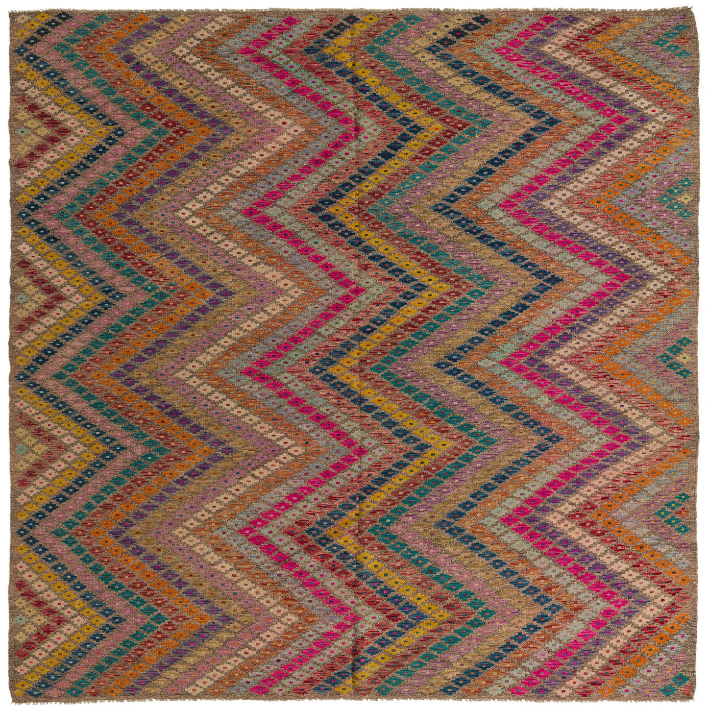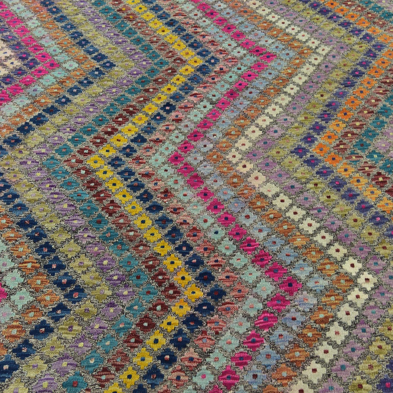 Hand-woven of 100% wool, this flatweave rug presents a lively geometric layout made up of tiny diamond motifs that line up to form broad chevron bands. The multi-hued background carries a layered palette — beige, cream and ivory balance deeper tones of navy blue, teal and olive, while accents of gold, orange, purple and red add energetic contrast. The surface has the firm, slightly textured hand of a true kilim: low and tightly woven with a subtle nubbiness that you can feel underfoot and that adds visual depth to each color shift.