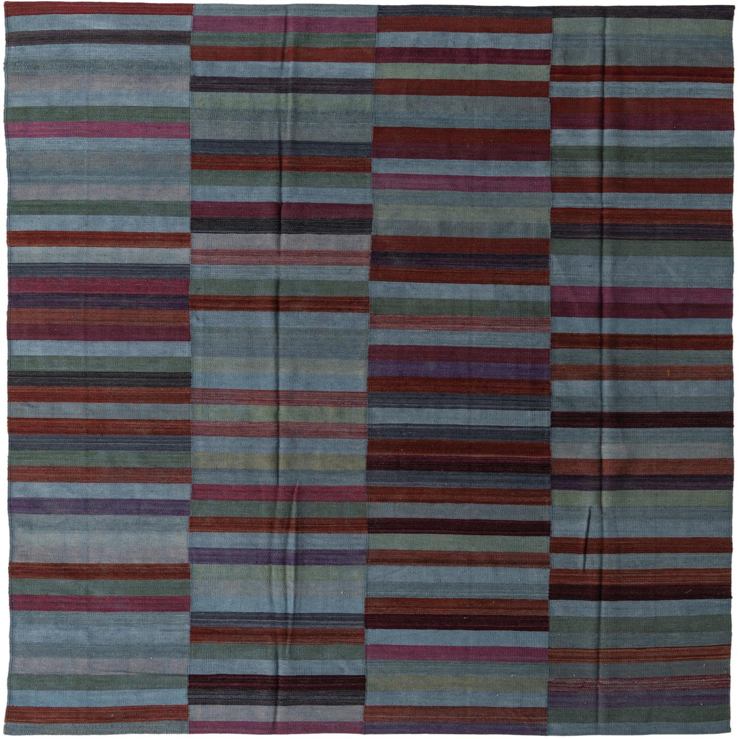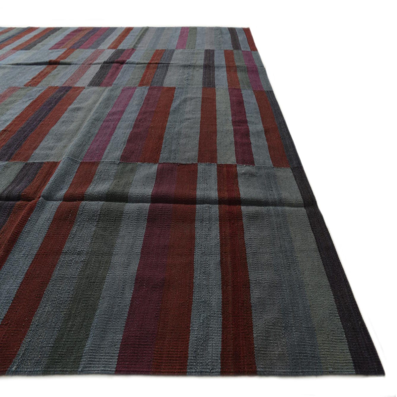 Hand-woven from 100% wool, this flatweave kilim presents a clean, linear pattern of narrow horizontal stripes arranged in alternating vertical panels. The background is multi-hued and the palette moves through blue, olive, gray, burgundy, violet, brown and black, creating a layered, lived-in colorway that reads both grounded and sophisticated. Run your hand across the surface and you’ll feel the fine, slightly textured weave typical of handwork—low in profile, with a tactile, woven grain that sits comfortably underfoot.