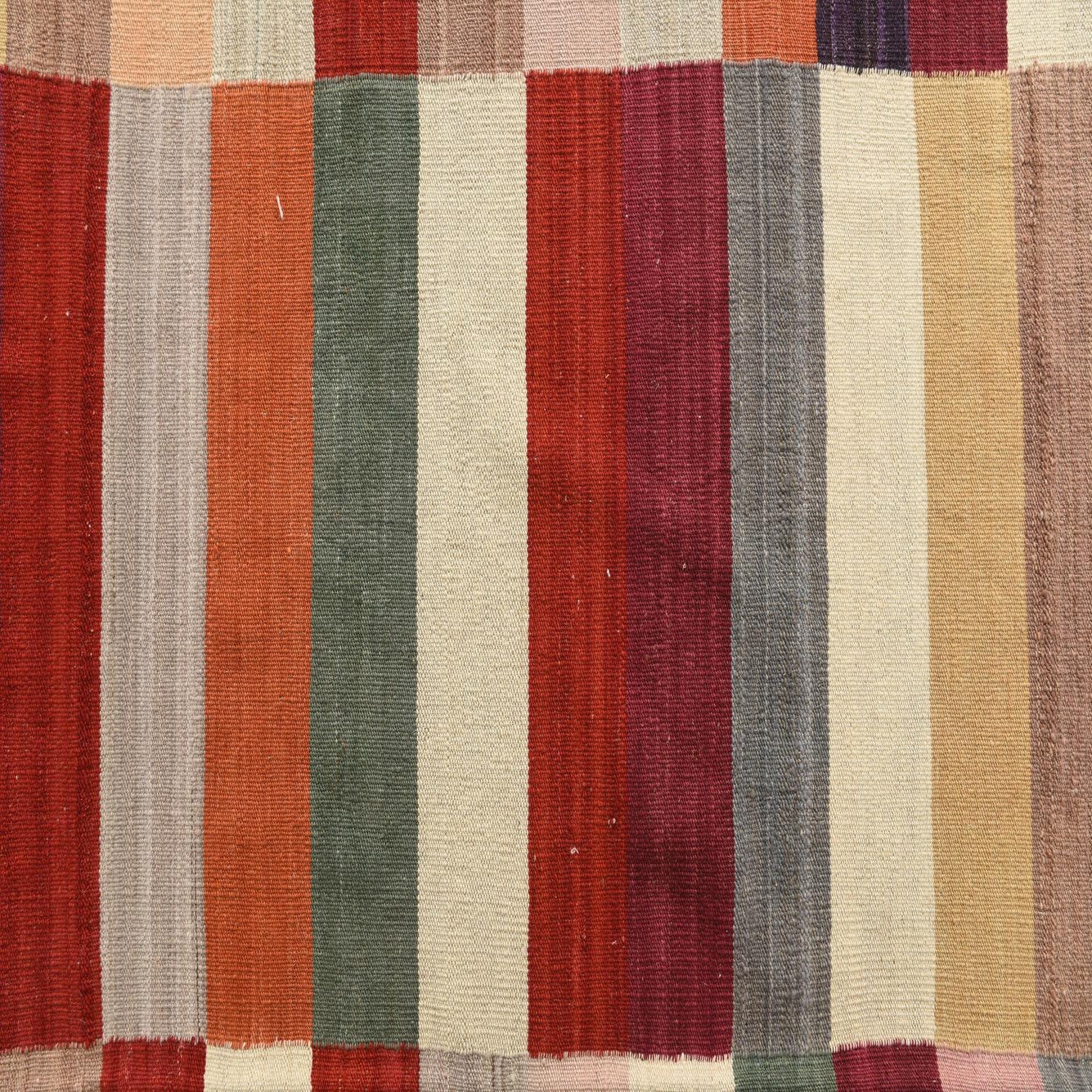 A large 8x11 multi-colored rectangular Kilim Modern wool rug with a vibrant striped tribal pattern, ideal for a living room.