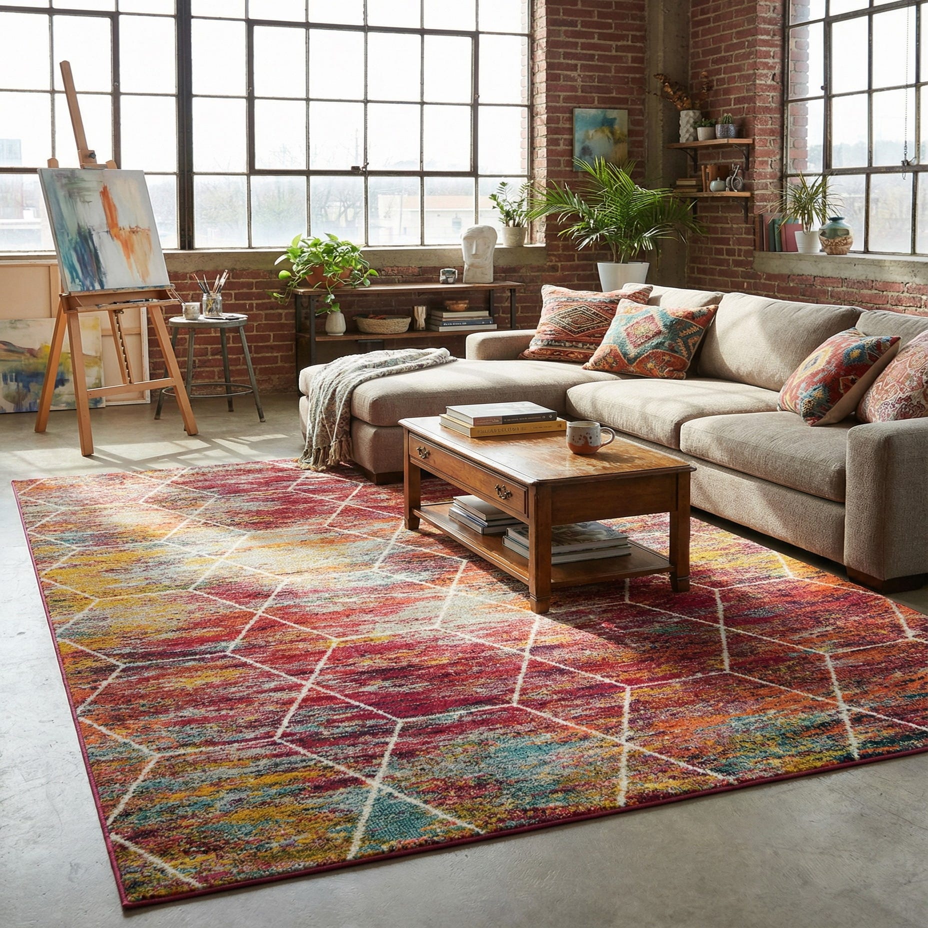 A vibrant 8x11 multi-colored rectangular rug featuring an abstract distressed background with a white modern trellis pattern.