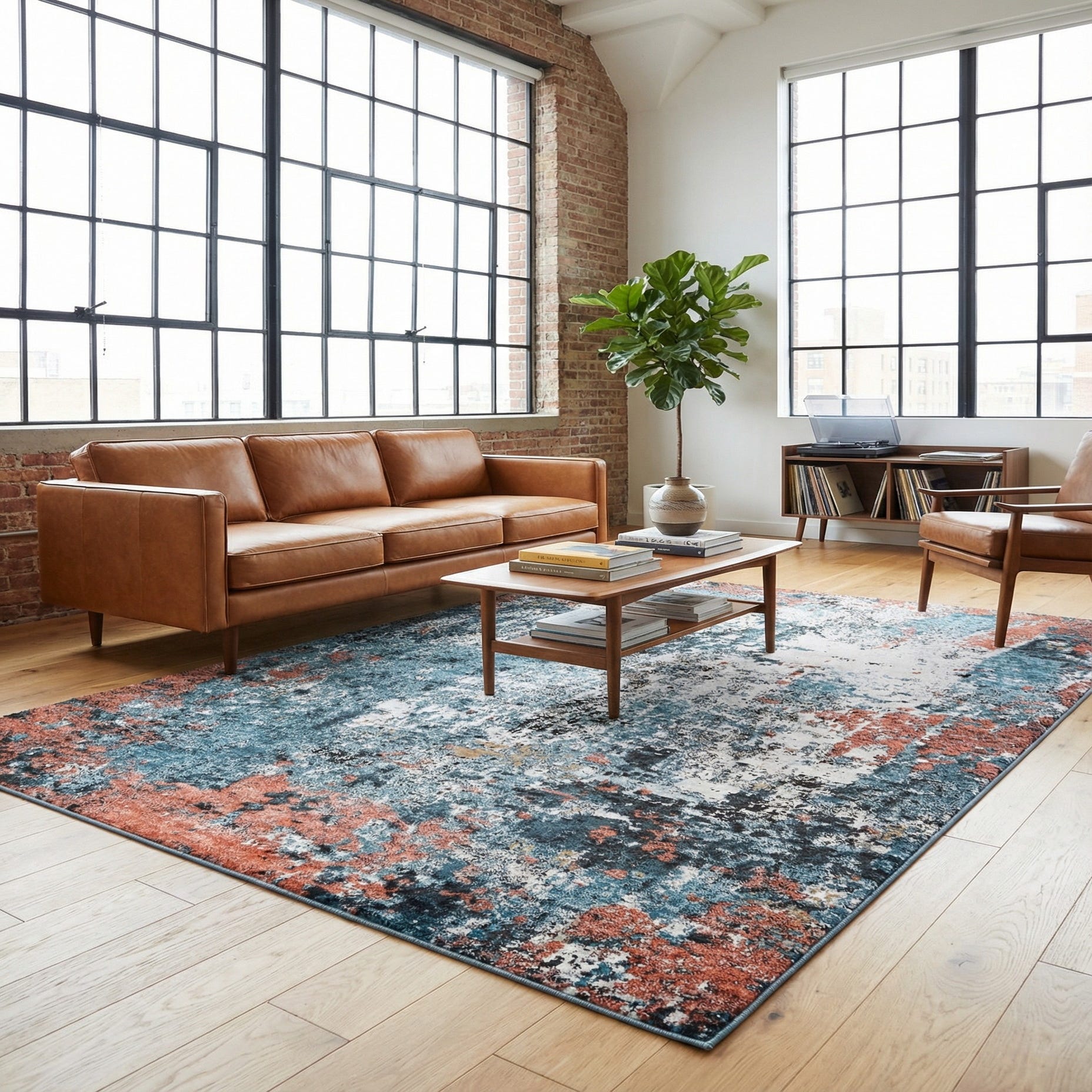 This rug works well as an anchor in contemporary living rooms, under a simple dining table, or layered in a bedroom to introduce color and visual interest. Pair it with neutral linen upholstery and warm wood furniture to balance the cool blues, or bring out the salmon tones with soft accent pillows and matte black metal details for a more graphic look. Its abstract motif adapts easily to modern, transitional, or industrial interiors and helps define seating areas in open-plan spaces.