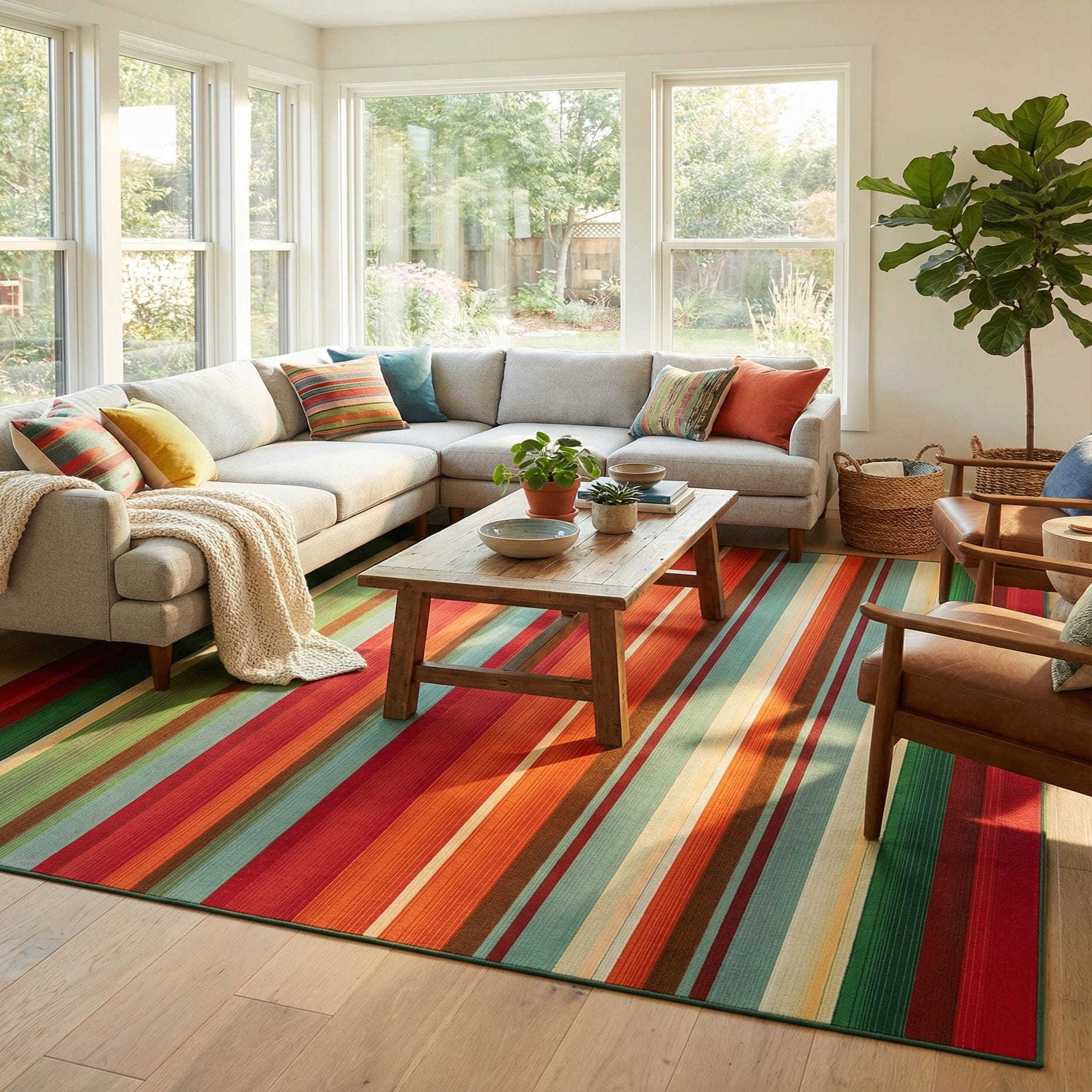 A vibrant 8x11 multi-colored striped rug with red, green, blue, orange, and cream bands, suitable for indoor or outdoor use.