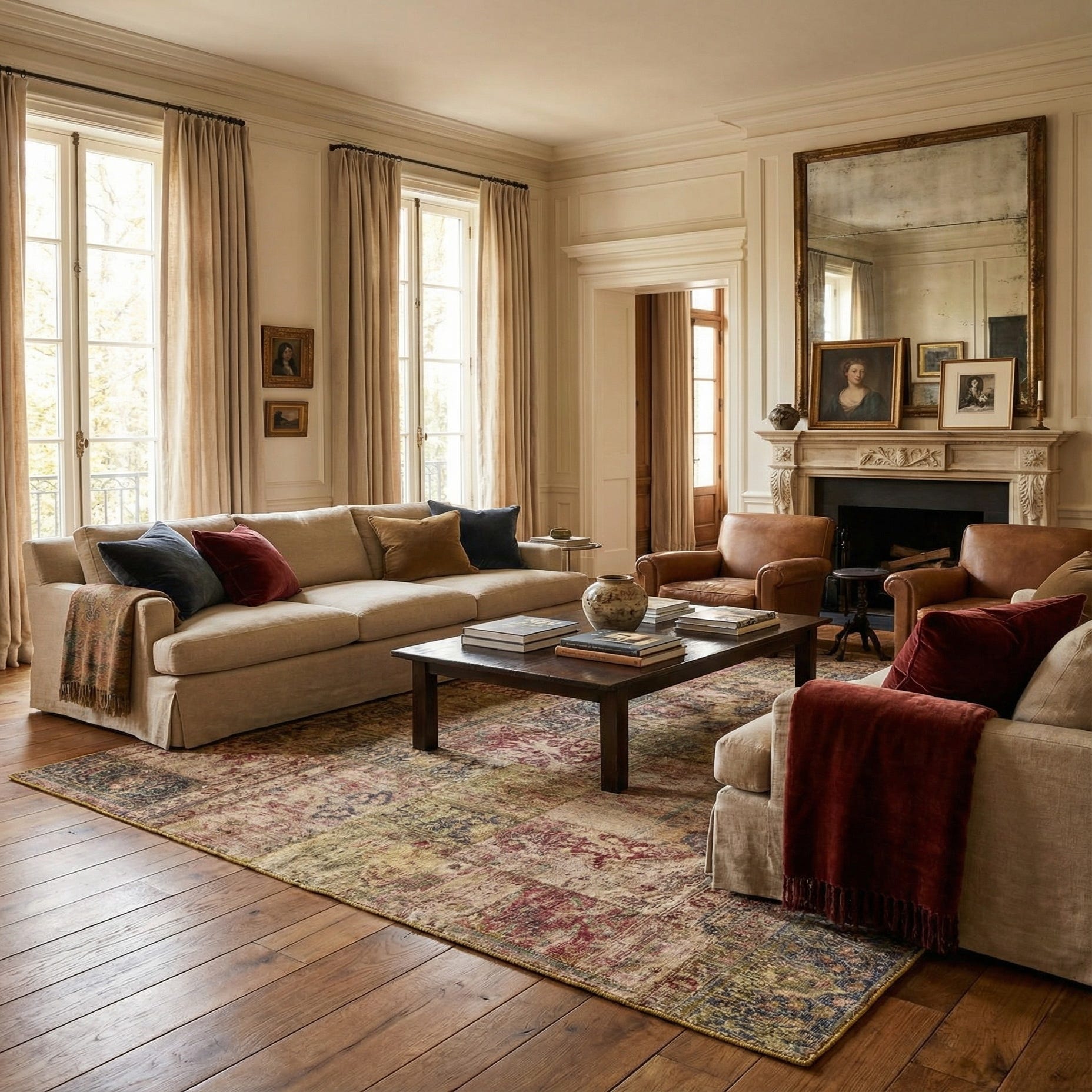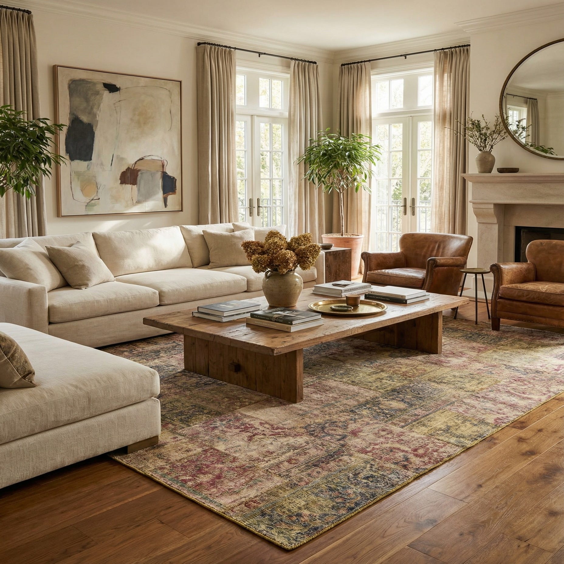 A rectangular 8x11 multi-colored wool rug with a distressed Persian patchwork design, featuring shades of red, blue, and yellow.