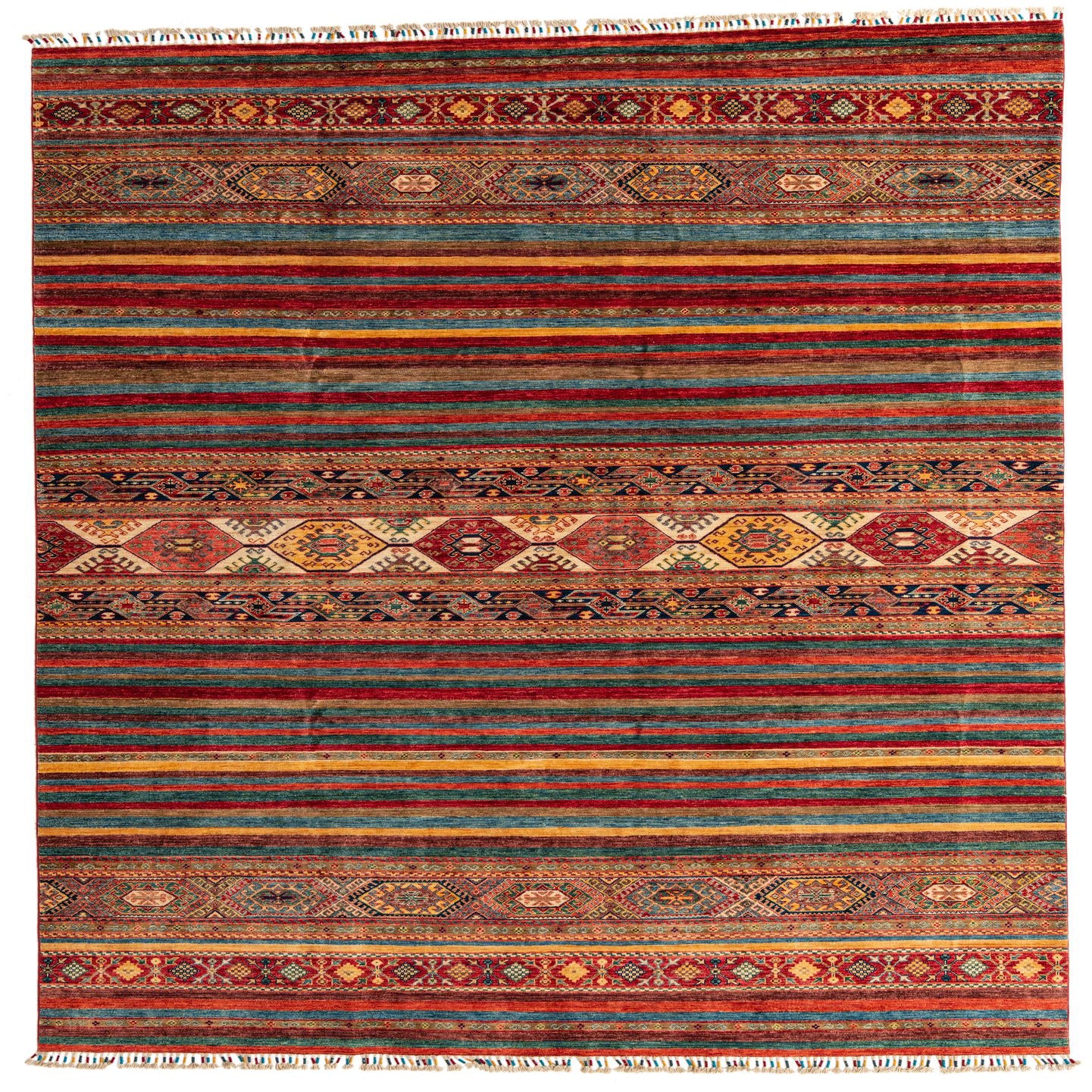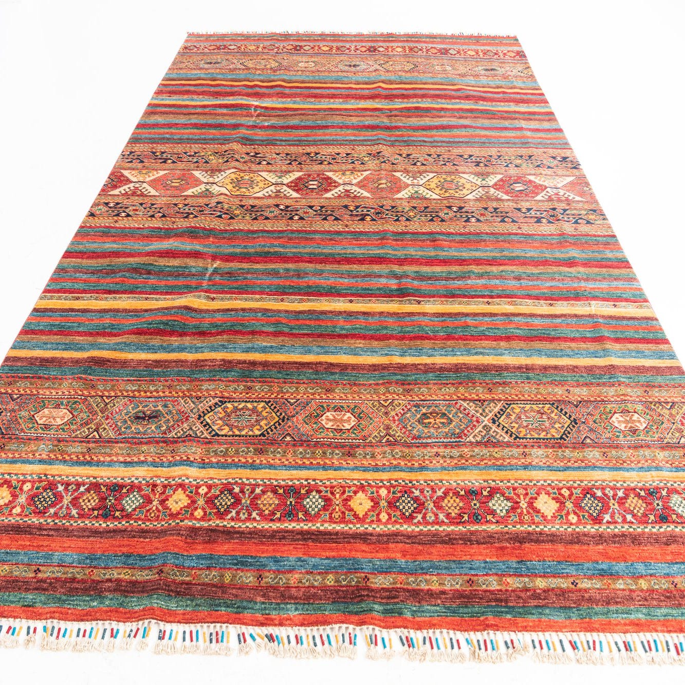 A vibrant 8x12 rectangular Ariana Ziegler rug with horizontal stripes in red, blue, yellow, and brown, interspersed with ornate geometric patterns.