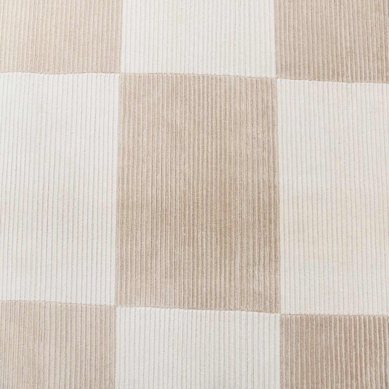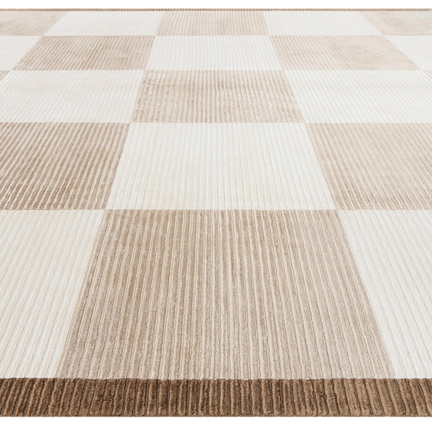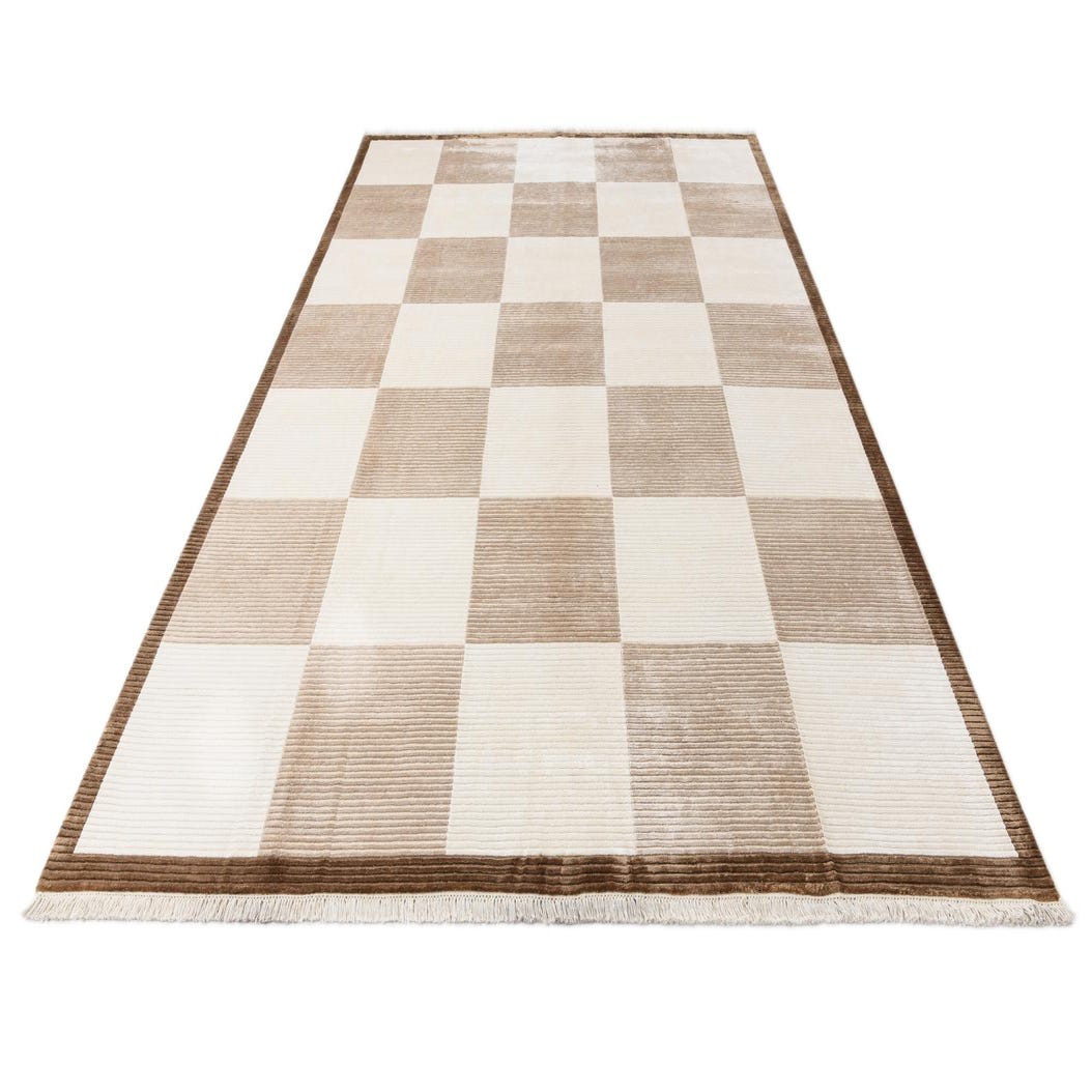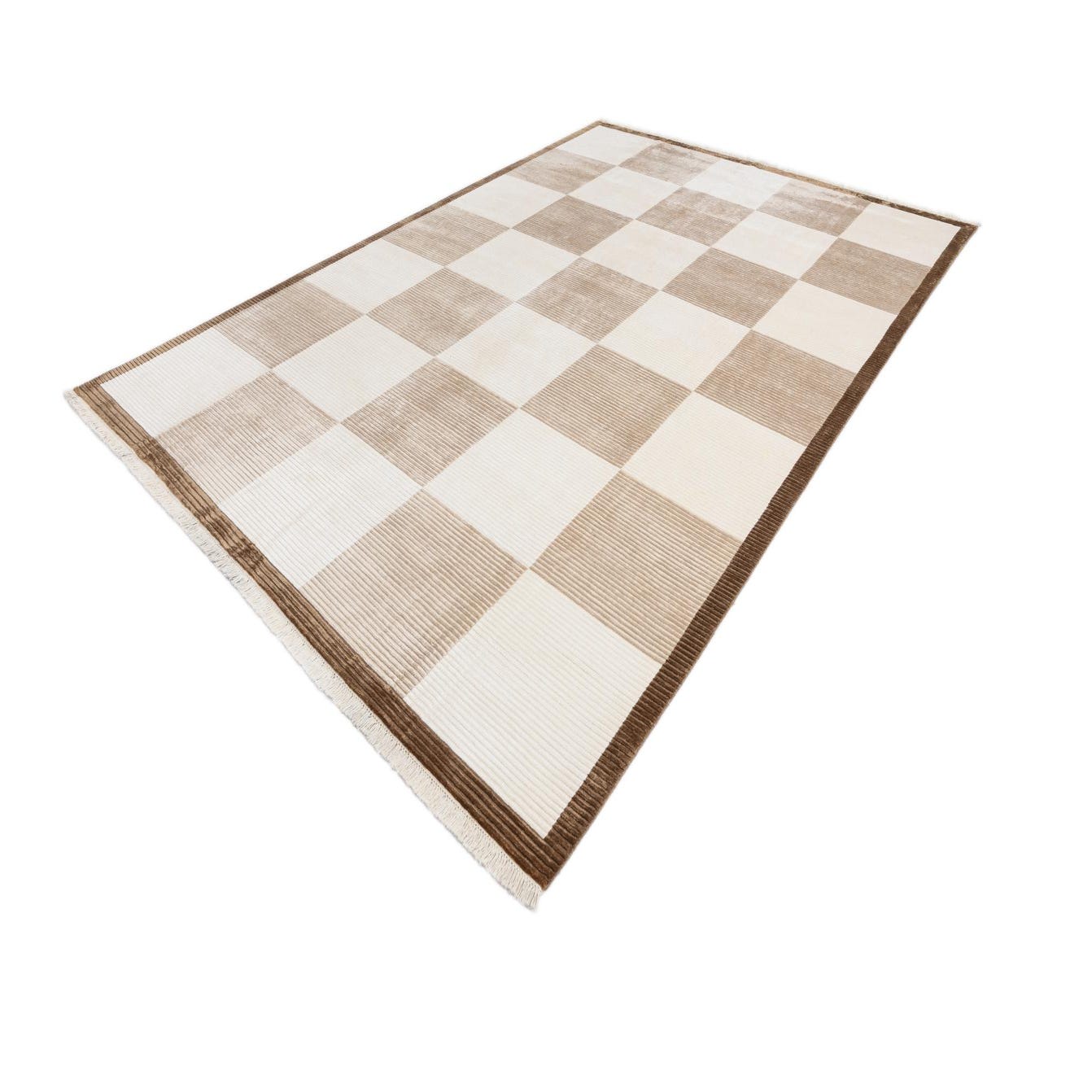 A rectangular 8x12 Darya rug featuring a modern checkered pattern in varying shades of beige and cream, with a dark brown fringed border.