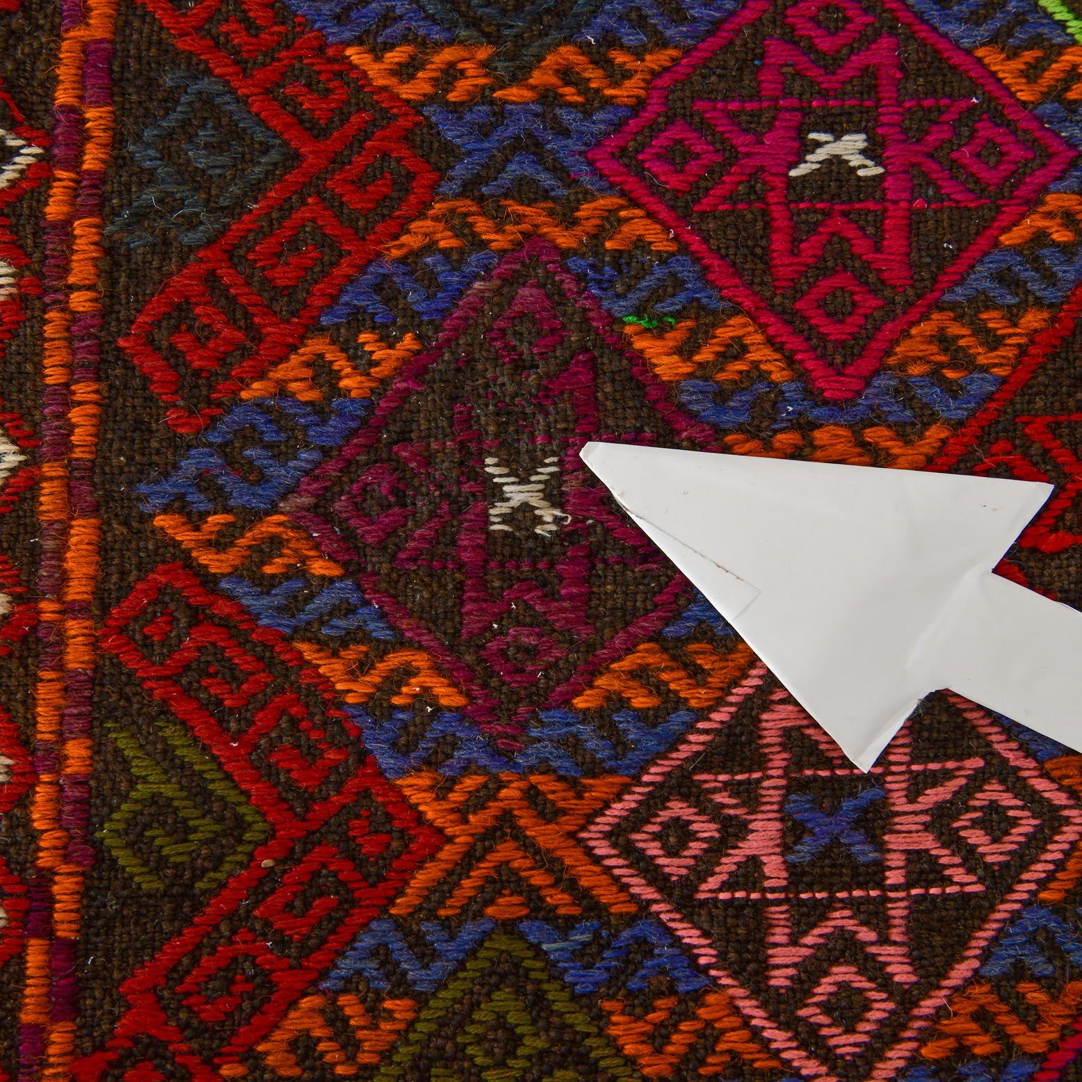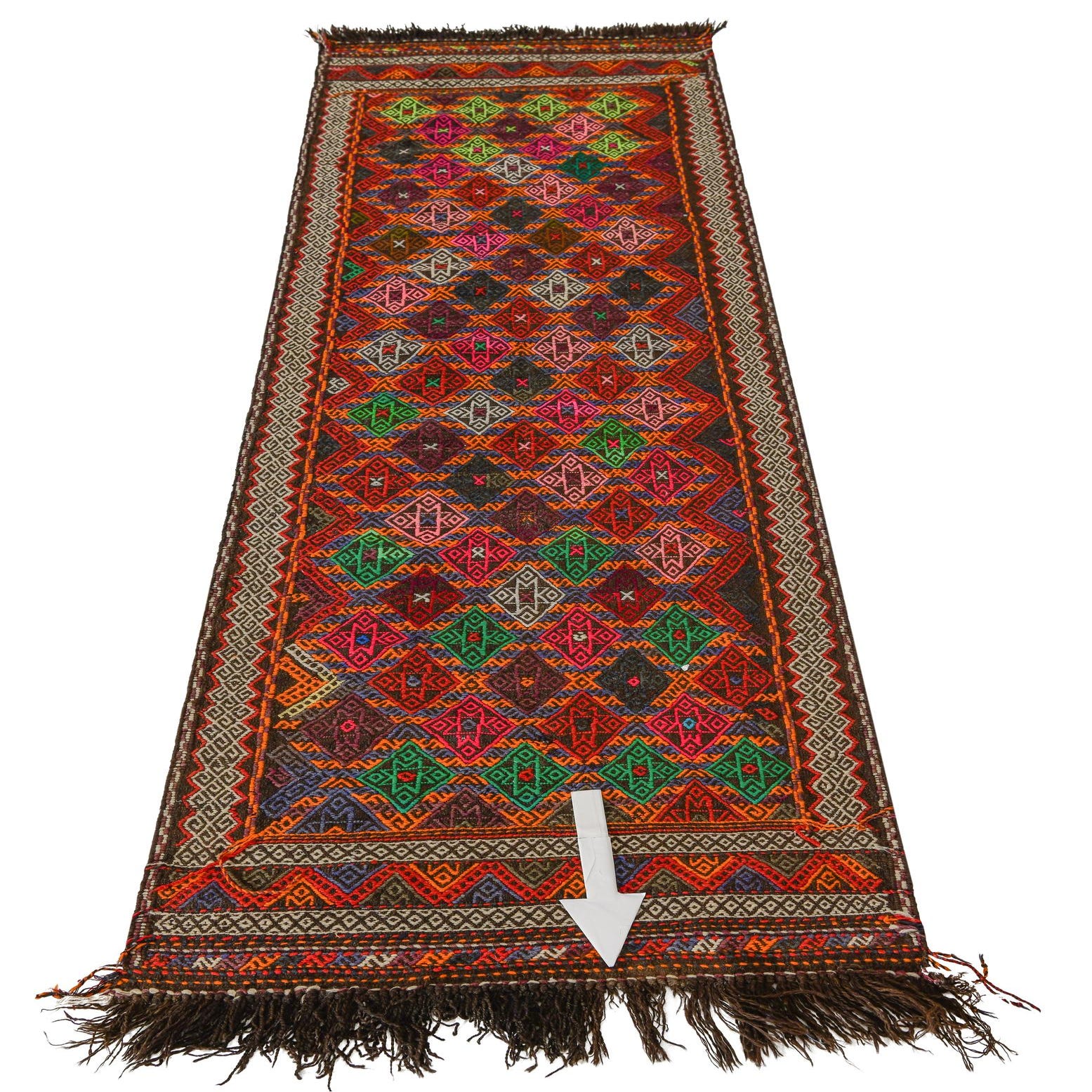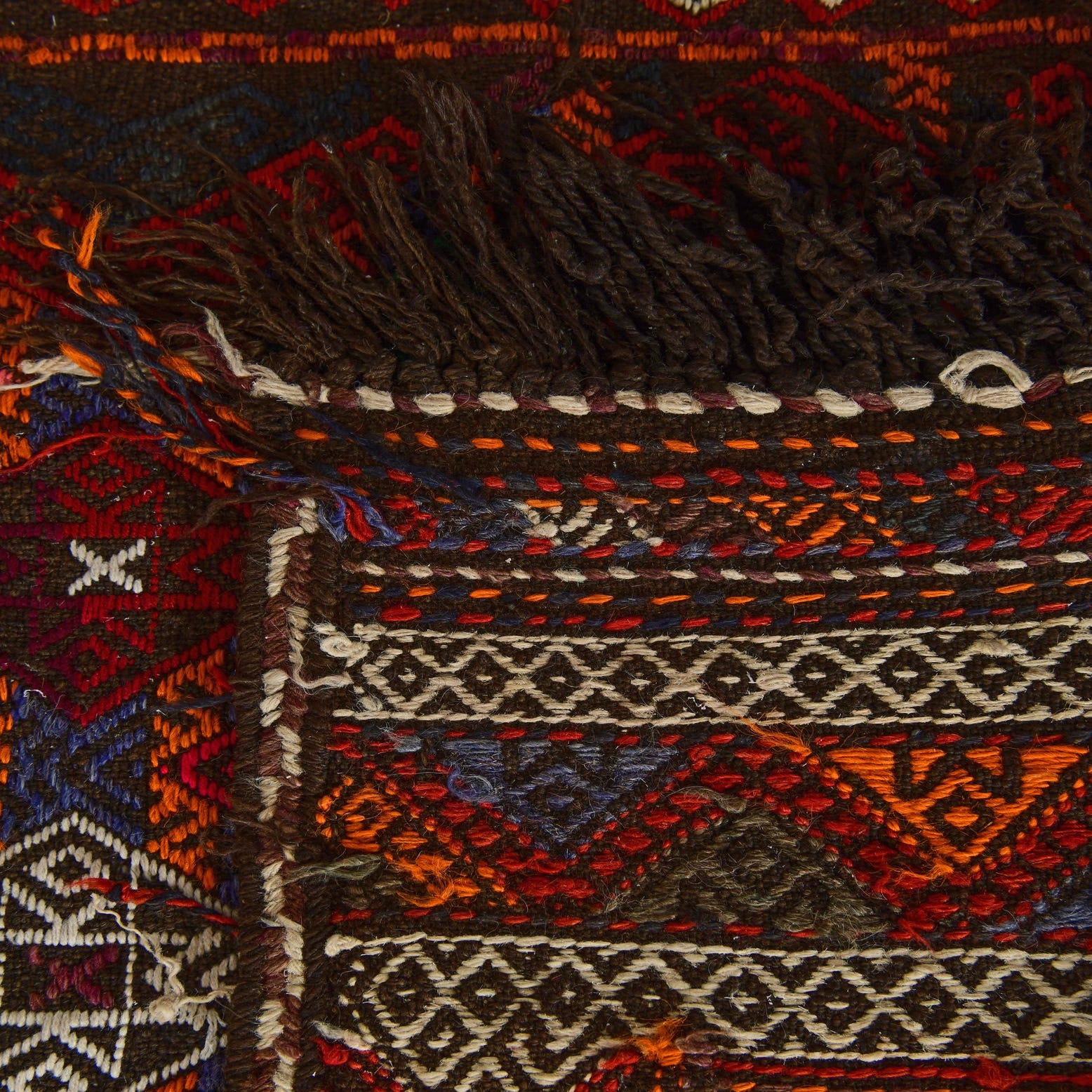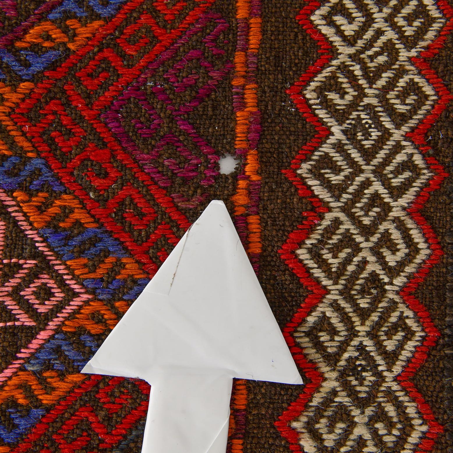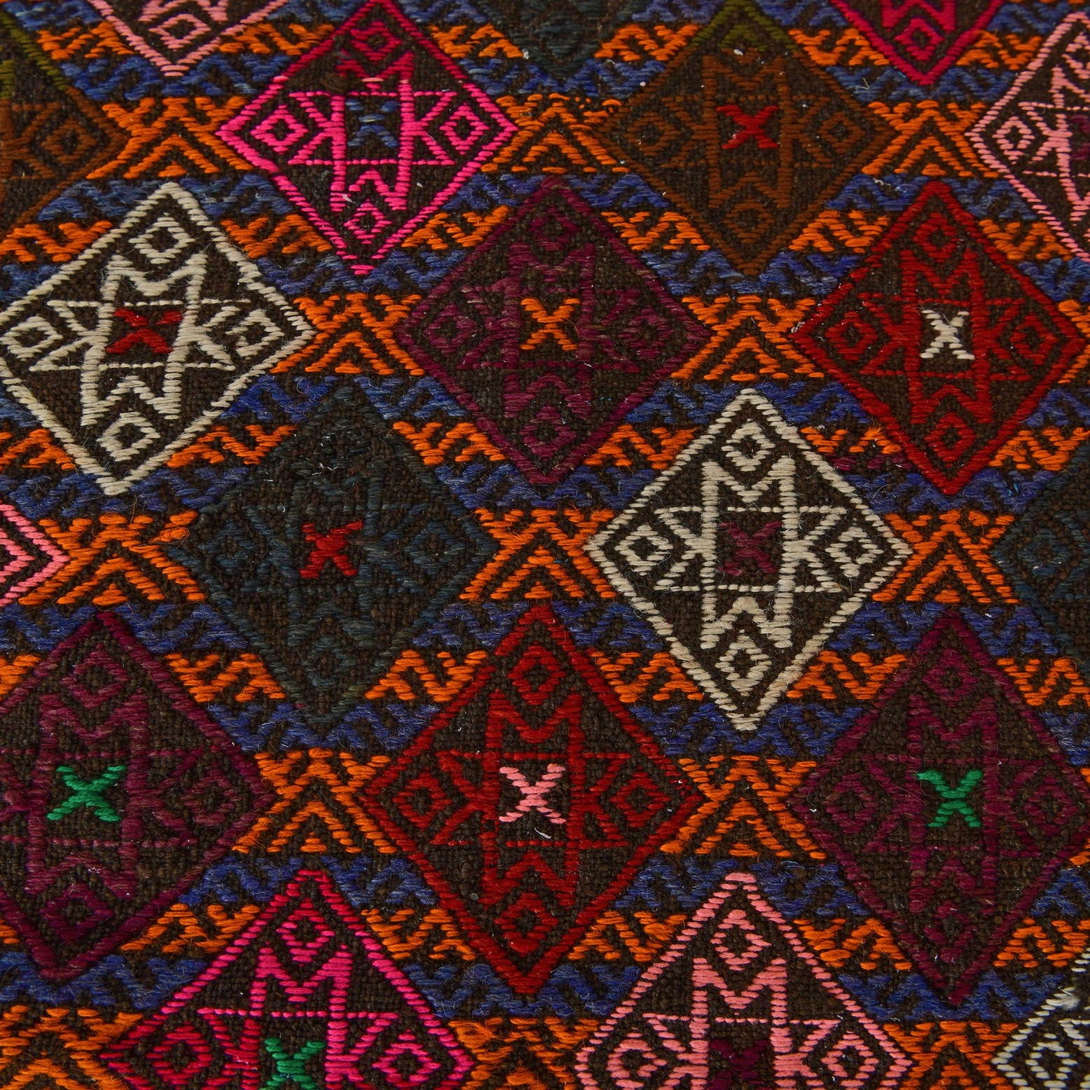 The Kilim Fars collection presents a 9 Ft Runner that showcases the timeless allure of traditional handwoven techniques paired with a rich tapestry of colors. Handwoven from 100% wool, this runner features a dynamic array of geometric patterns, creating a captivating visual narrative across its length. It is a medley of vibrant hues, including black, blue, brown, green, ivory, orange, red, purple, and pink, set against a multi-colored background.