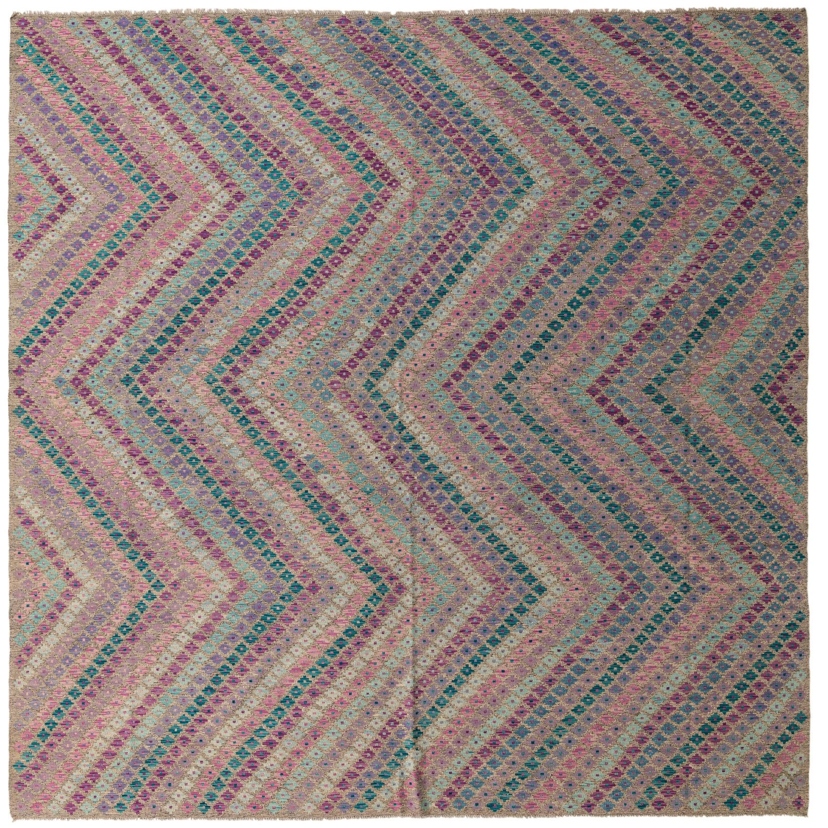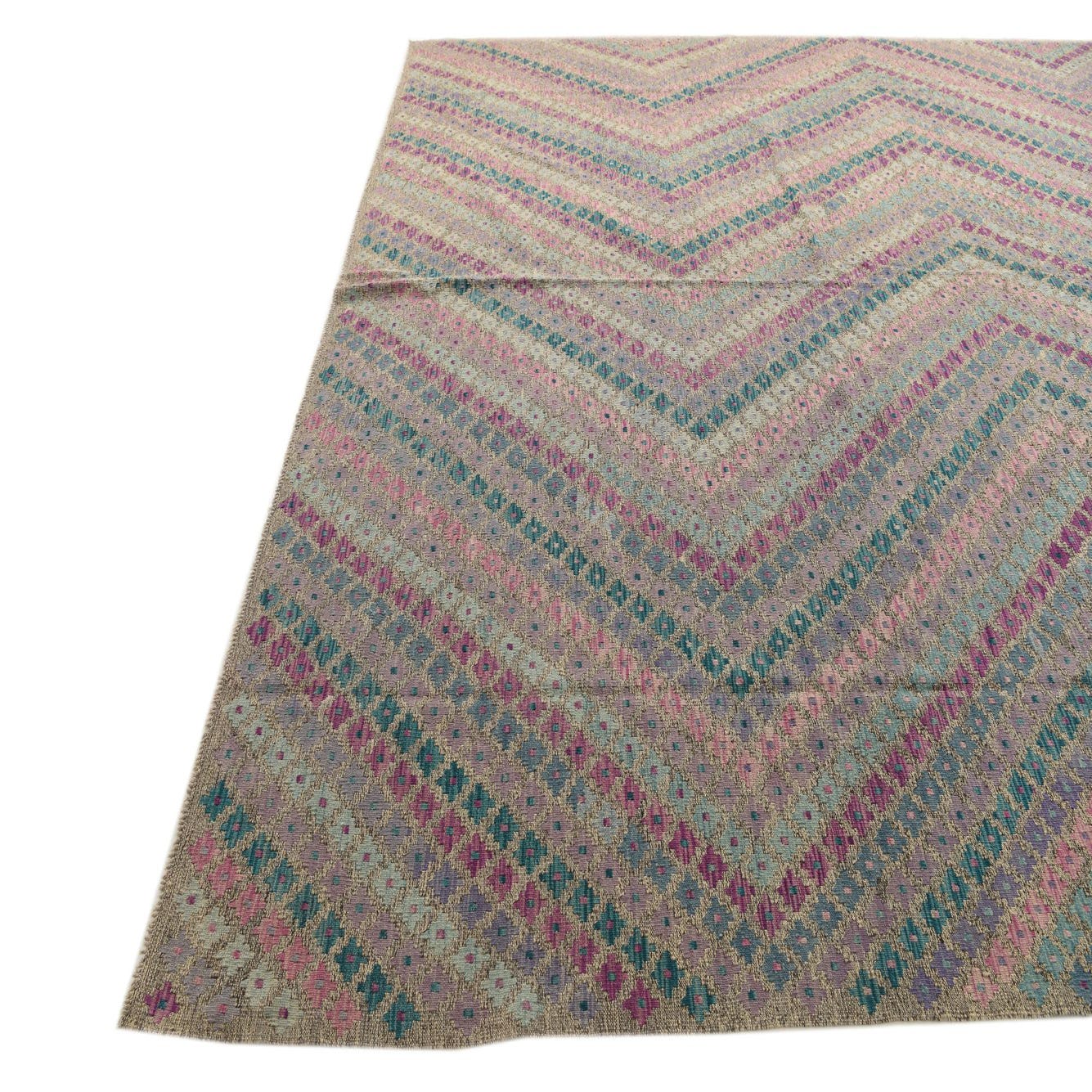 From the Kilim Modern collection, this hand-woven 100% wool rug measures 9x11 and presents a dynamic chevron pattern, imbued with a palette that includes multi, beige, blue, brown, olive, red, and green hues. The multi-toned background sets a vivid stage for the pattern, where the harmonious color transition delivers a rhythmic visual experience. Its flatweave texture and neatly incorporated fringe enhance the piece's tactile and visual appeal.
