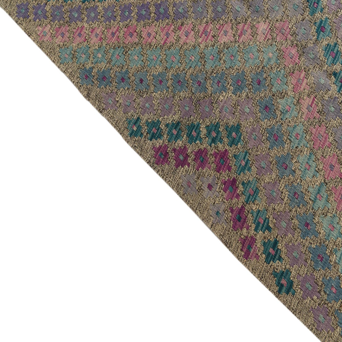 The Kilim Modern rug's design versatility makes it suitable for a variety of interior design scenarios, ranging from eclectic and bohemian spaces to more contemporary and minimalist settings. In a living room, it can serve as a statement piece against neutral furniture, or in a dining room, it adds a layer of warmth and sophistication. The rug’s flatweave construction allows it to lie seamlessly in high-traffic areas, providing both style and durability. Its array of colors can also help to tie together various elements within a room, making this rug a versatile candidate for integrating into established decor schemes.