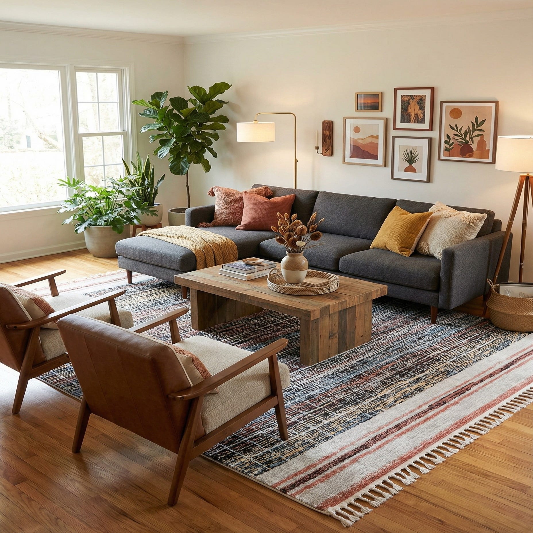 This rug works well where you want pattern and color without overwhelming the space — under a living room seating area, beneath a dining table, or anchoring a home office. Pair it with warm wood furniture and leather seating to echo the rust and brown hues, or soften the palette with ivory textiles and light blue accents. Its balanced mix of color and linear detail complements contemporary, transitional, and mid-century inspired interiors.