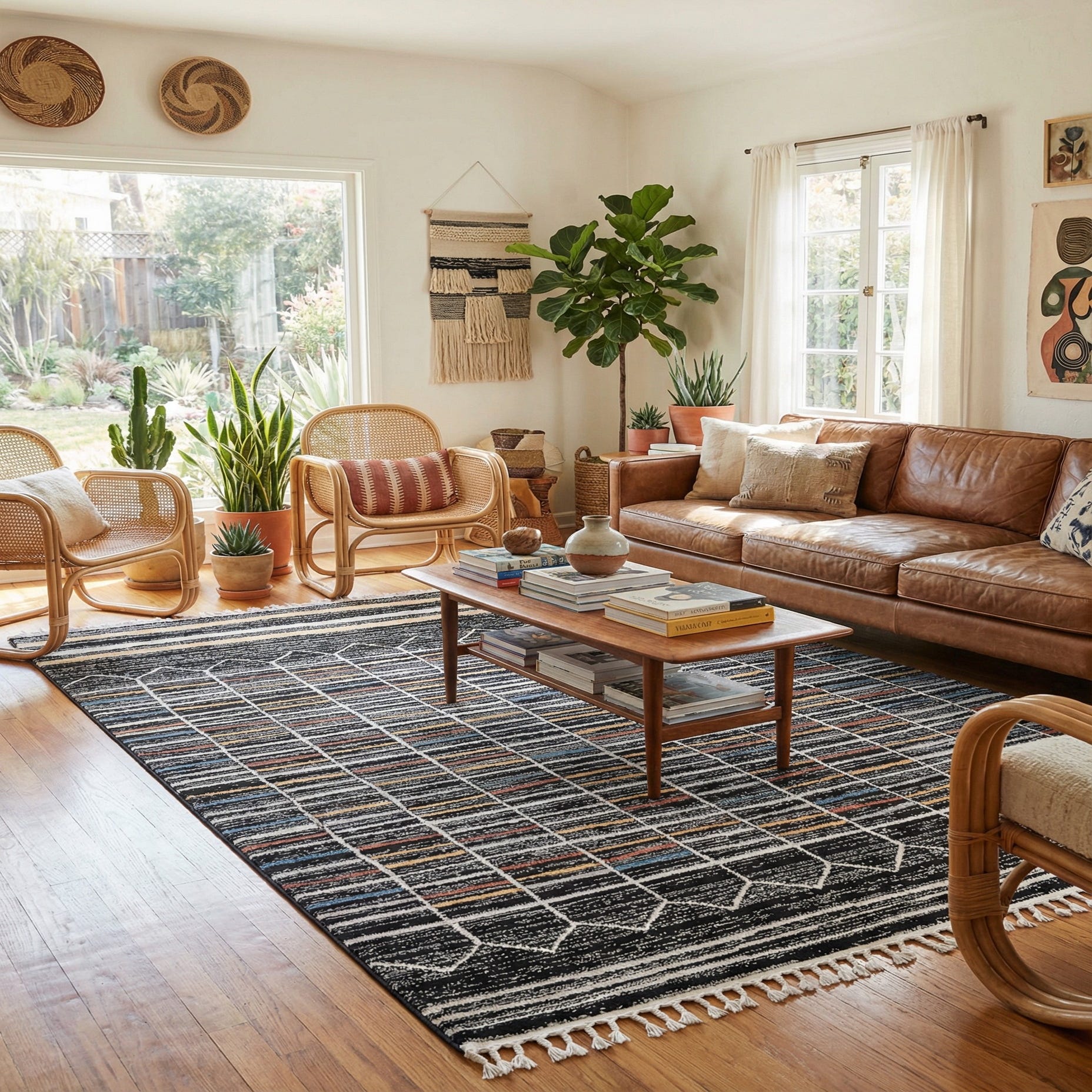 The low-profile pile of polypropylene delivers a soft, slightly textured hand and clean pattern definition that sits well beneath furniture. Use it to anchor a living room seating group with neutral sofas and a wood coffee table, place it under a dining table to add graphic contrast to chairs, or layer it in a bedroom with mixed materials for an eclectic look. Pair with beige or ivory upholstery to let the darker stripes provide contrast, or coordinate with blue and peach accessories and matte-black finishes for a contemporary vibe.