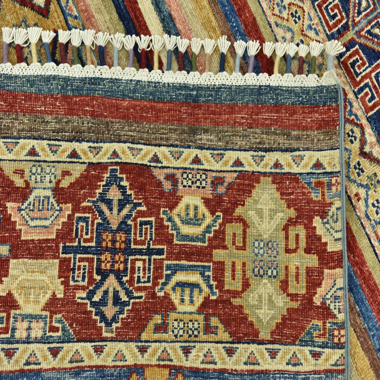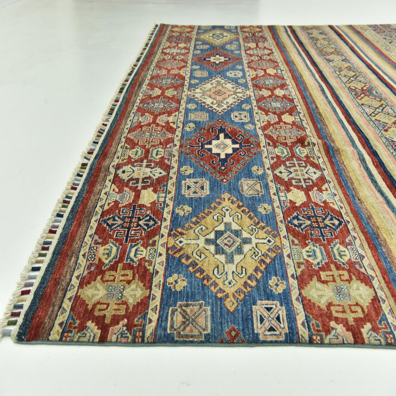 The Ariana Ziegler collection presents a 9x12 hand-knotted rug that is a testament to traditional craftsmanship. This rug is meticulously created using 100% hand-spun wool, offering a durability that complements its timeless style. It features a multi-colored background with harmoniously blended hues including beige, blue, brown, red, navy blue, and gold. The pattern is a sophisticated amalgamation of geometric and tribal motifs, which are symmetrically aligned to bring a sense of balance and rhythm to the design.