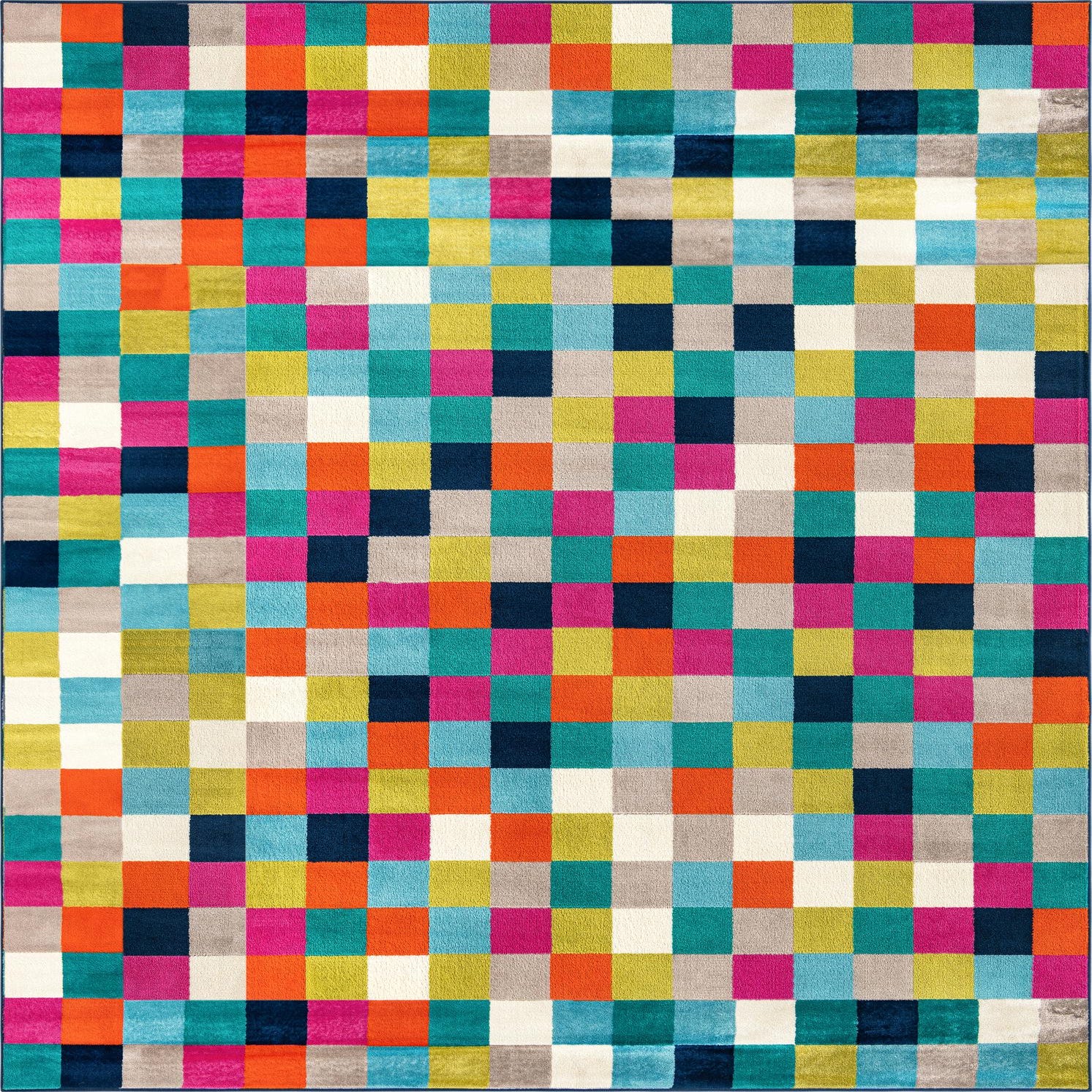 The Azalea Collection offers a dynamic and colorful addition to any room with this 9x12 rug. Its pattern is a vibrant checkerboard that seamlessly integrates a spectrum of colors including blue, gray, ivory, light blue, light green, navy blue, orange, teal, and turquoise, set against a multi-colored background that ties the palette together. Machine woven of 100% polypropylene, the rug promises durability and a soft texture, suitable for high traffic areas.