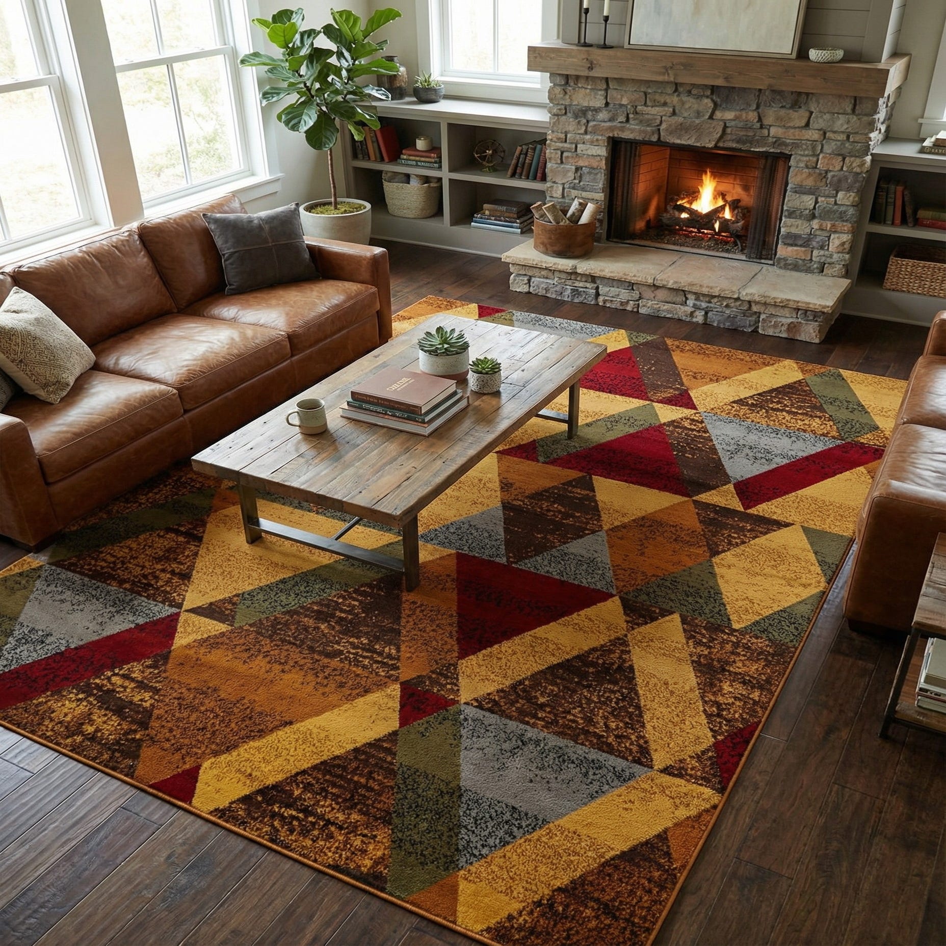 Machine-made from 100% polypropylene, the rug has a low-profile, tightly woven pile that feels smooth yet substantial underfoot and stands up well to daily use. It works well as the anchor for a living room seating arrangement, beneath a large dining table, or in a home office where pattern-driven color ties the room together. Pair it with warm wood furniture and leather seating for a grounded, contemporary look, or use it in a transitional or eclectic space to introduce structured pattern and autumnal color warmth.