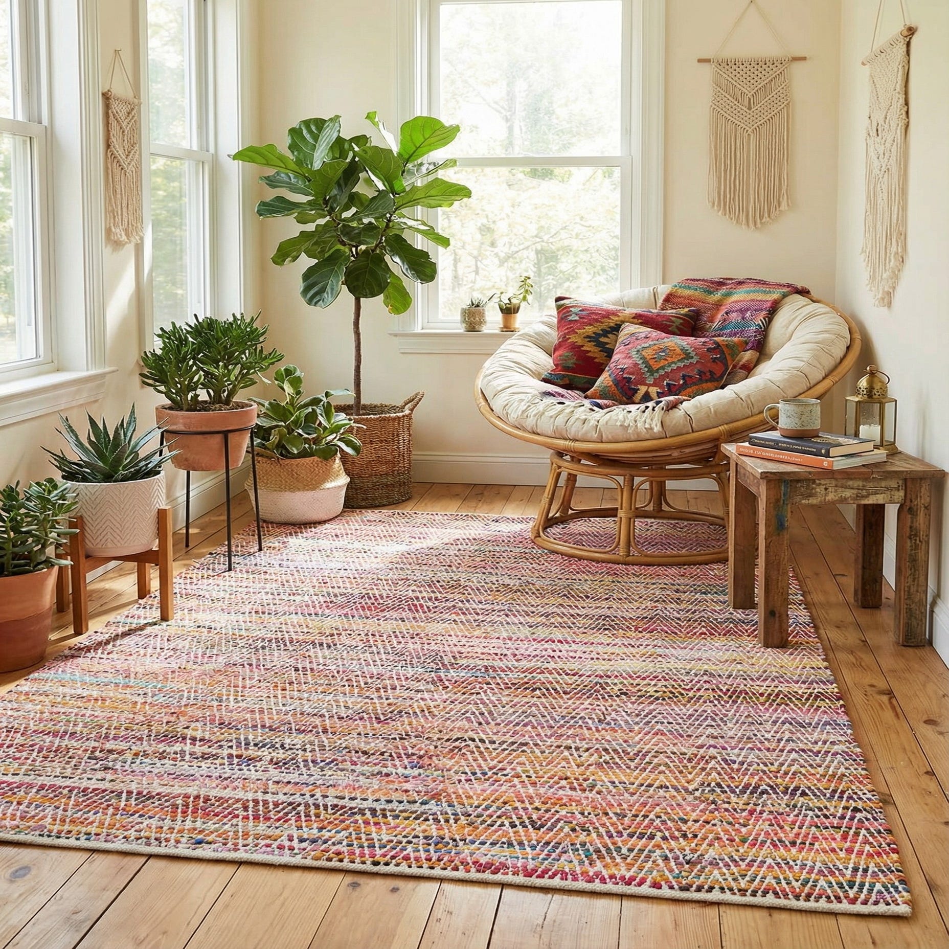 This versatile rug works well in casual, collected interiors: place it under a coffee table to brighten a neutral living room, layer it in a sunlit dining area to add warmth to a wood table, or use it in a playroom or entryway for a durable splash of color. It also pairs nicely with mid-century modern furnishings or bohemian decor, where its graphic chevron and mixed palette can complement clean lines or eclectic textiles.