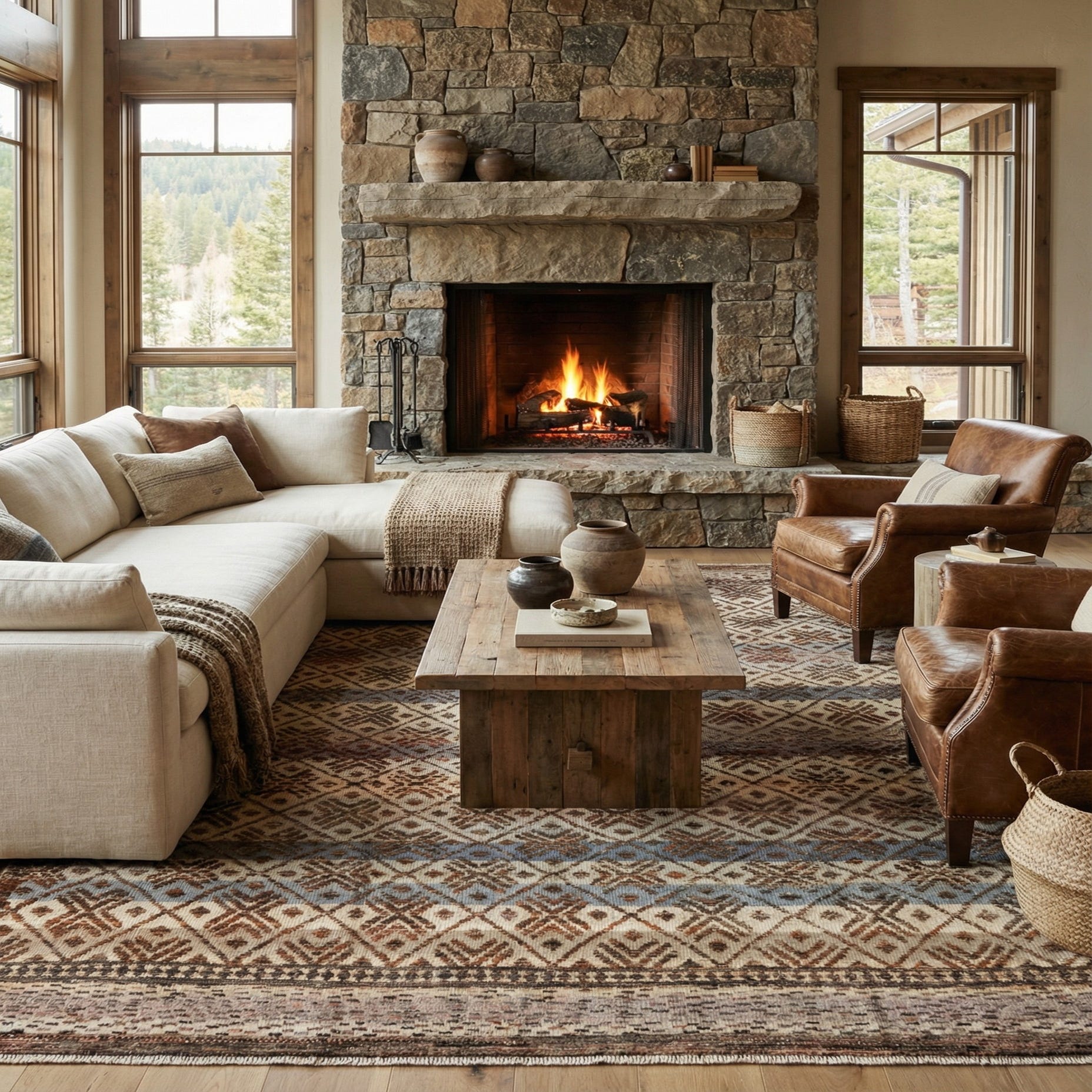 The hand-knotted wool construction produces a tactile, low- to medium-pile surface that feels warm and comfortable underfoot, with natural wool texture and gentle color variation across the field. This rug anchors a seating area in a living room, pairs well beneath a dining table, and will ground a bedroom layered with neutral linens. It works especially well with warm wood furniture, leather accents and linen upholstery in transitional, modern farmhouse, or global-inspired interiors, and the blue banding makes it a natural fit for coastal or casual coastal-adjacent schemes.