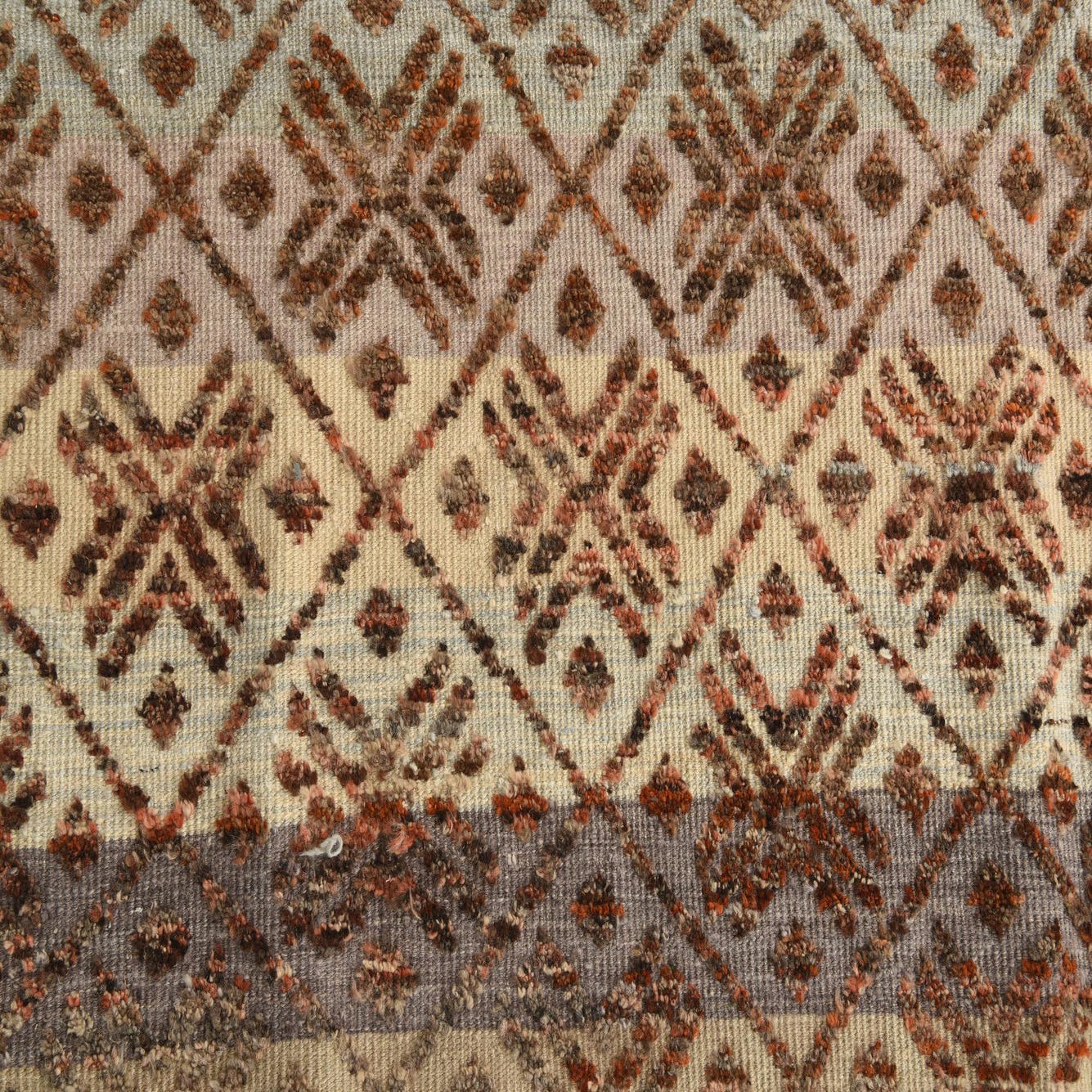 A repeating diamond-lattice pattern of stylized floral medallions gives this hand-knotted 100% wool rug a quietly structured look. The multi background is warmed by layers of beige, light brown and ivory, while bands of muted blue and touches of green and deeper brown thread through the design to add subtle contrast and rhythm. The pattern balances traditional geometric motifs with a slightly worn, vintage-inspired palette that reads as both familiar and refined.
