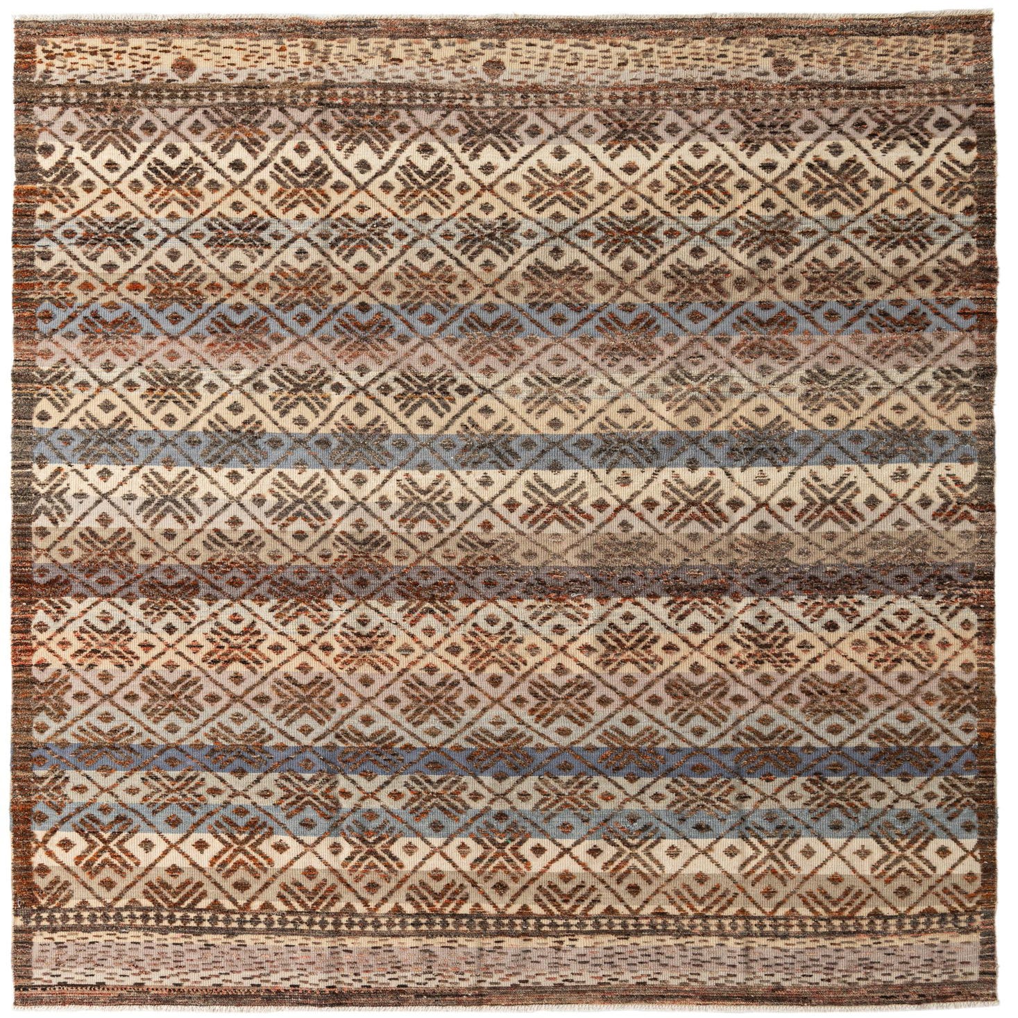 A 9x12 rectangular Darya rug with a modern, multi-colored geometric pattern in warm browns, creams, and cool blue stripes.
