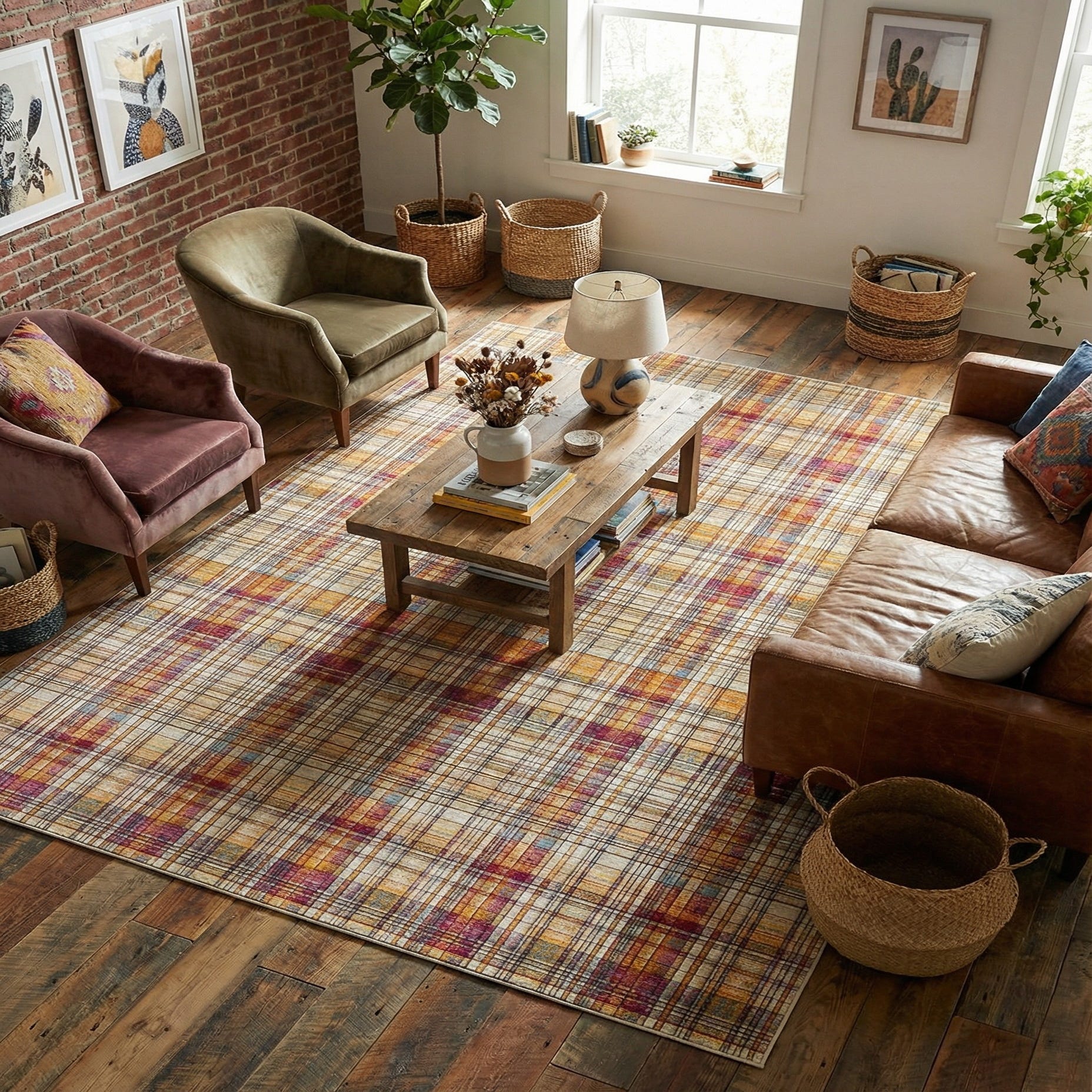 A crisp, linear plaid pattern defines this rug, with a network of fine intersecting lines and soft, blurred color blocks that create depth across a multi-colored background. Beige and gray fields provide a neutral foundation while thin black and brown lines offer structure. Brighter threads of red, violet and gold weave through the grid, giving measured pops of color that animate the surface without overpowering the overall design.