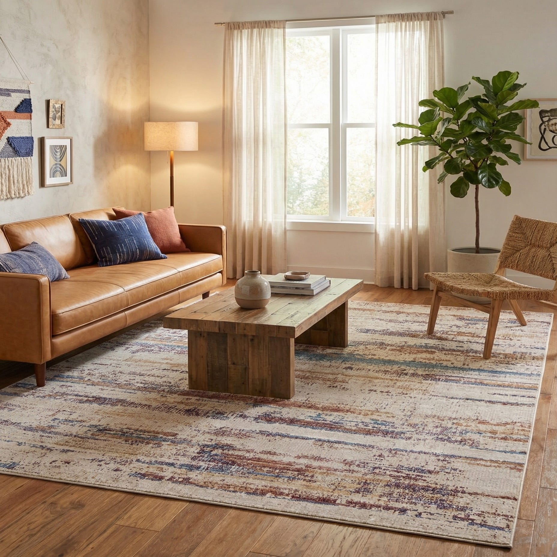 Suitable for contemporary and modern decor, this piece can serve as a focal point in a living room, dining area, or open-concept space. It can also harmonize with more eclectic interiors, bridging various color schemes and styles with its multi-hued design. Its large dimensions make it ideal for anchoring furniture arrangements and creating an inviting ambiance in spacious rooms.