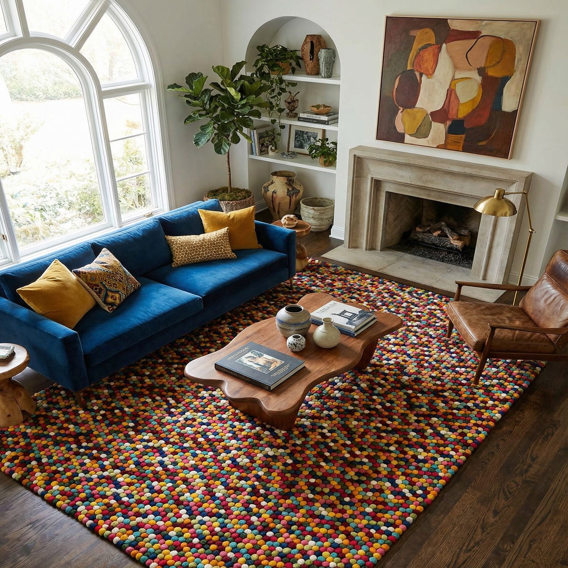 This rug suits casual and eclectic interiors as well as contemporary schemes that need a lively color anchor. Place it in a family room or playroom to add warmth and tactile interest, layer it under a neutral sofa and natural wood furniture to let the colors pop, or use it in a reading nook or entry to bring an inviting, artistic touch to the space. It also complements mid-century and bohemian styles, pairing nicely with mixed textiles, indoor plants and simple, clean-lined furnishings.
