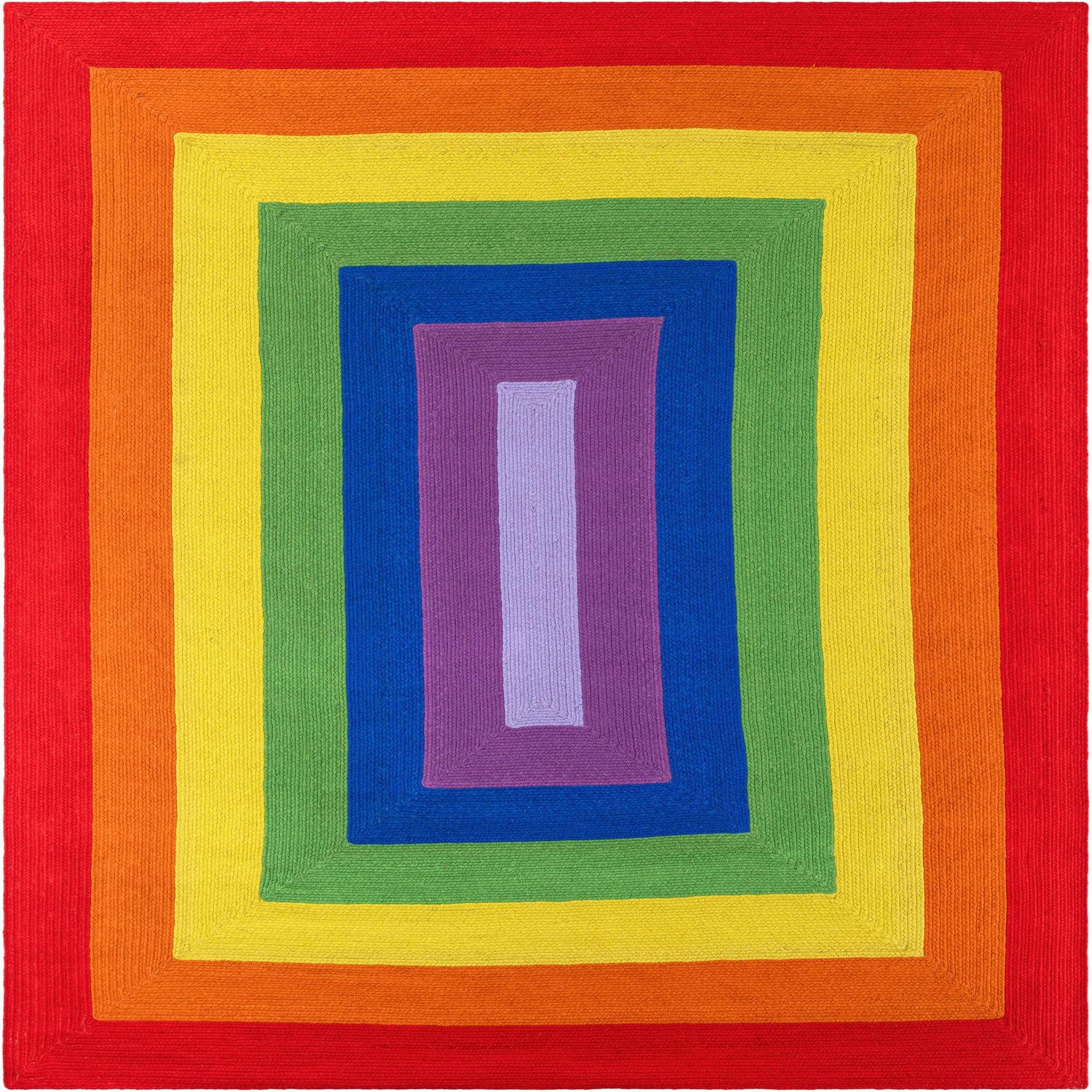 A vibrant 9x12 rectangular hand-braided wool rug featuring a modern rainbow pattern with concentric rectangles in red, orange, yellow, green, blue, and purple.