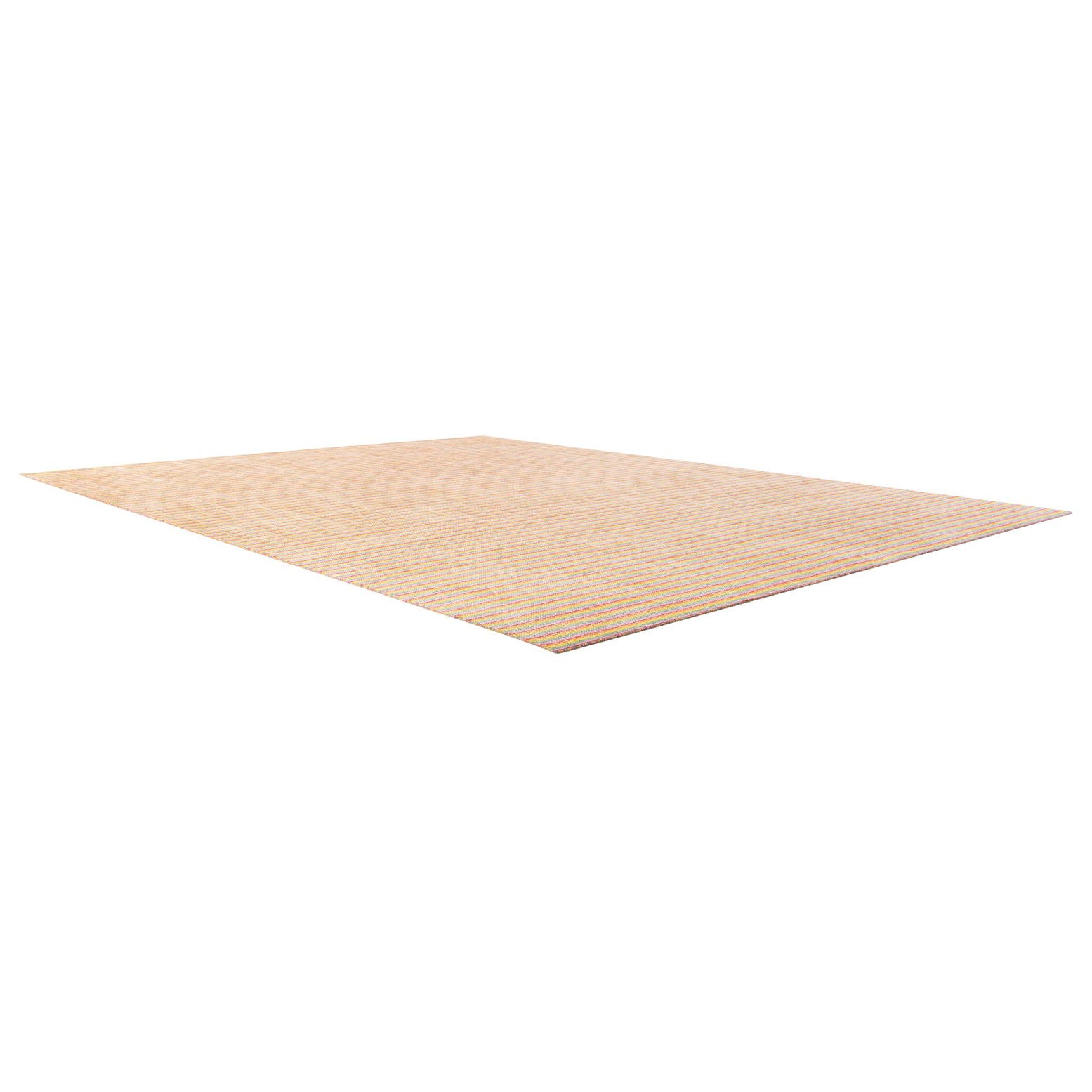 A vibrant 9x12 multi-colored rectangular wool area rug with thin horizontal stripes, perfect for a living room.