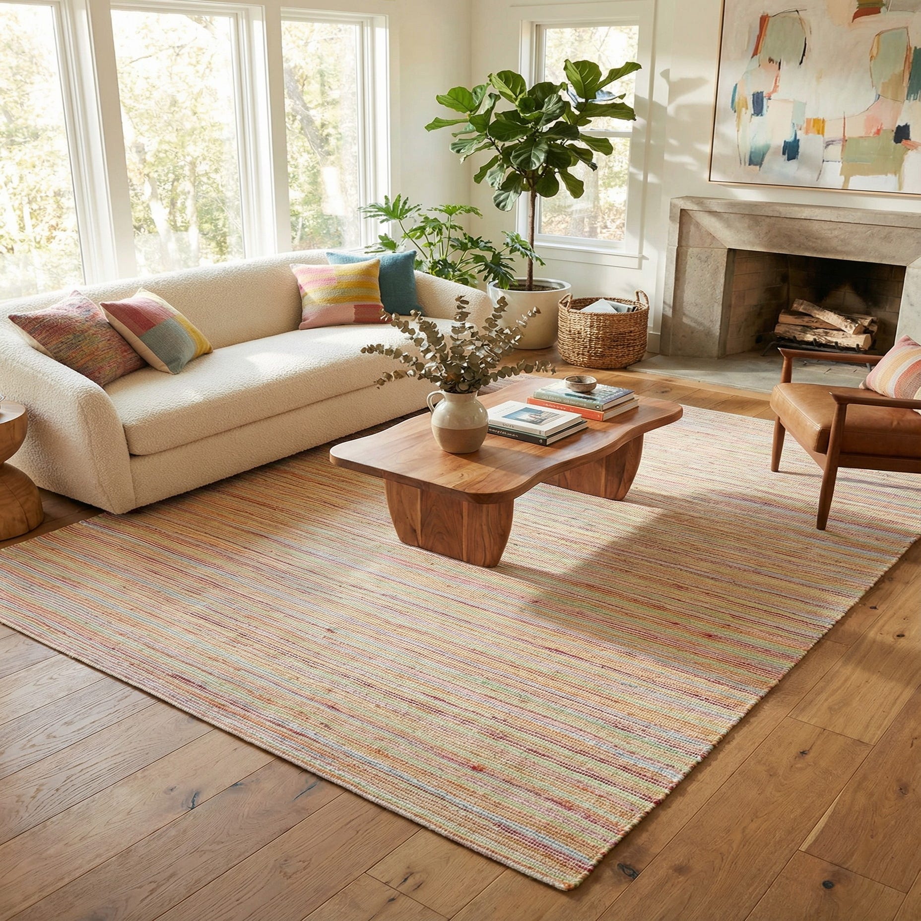 A fine, horizontal stripe pattern brings a playful, lived-in character to the surface with narrow bands of green, light blue, orange, red, yellow, pink, ivory and violet woven into a multi-tone ground. Hand Woven of 40% Jute, 40% Wool & 10% Cotton, the construction produces a low, flat profile with a subtle slub and a tactile, slightly nubby hand that feels natural underfoot. The overall effect is layered color rather than bold blocks—soft pops of hue sit comfortably against the neutral multi background for an easy, approachable look.