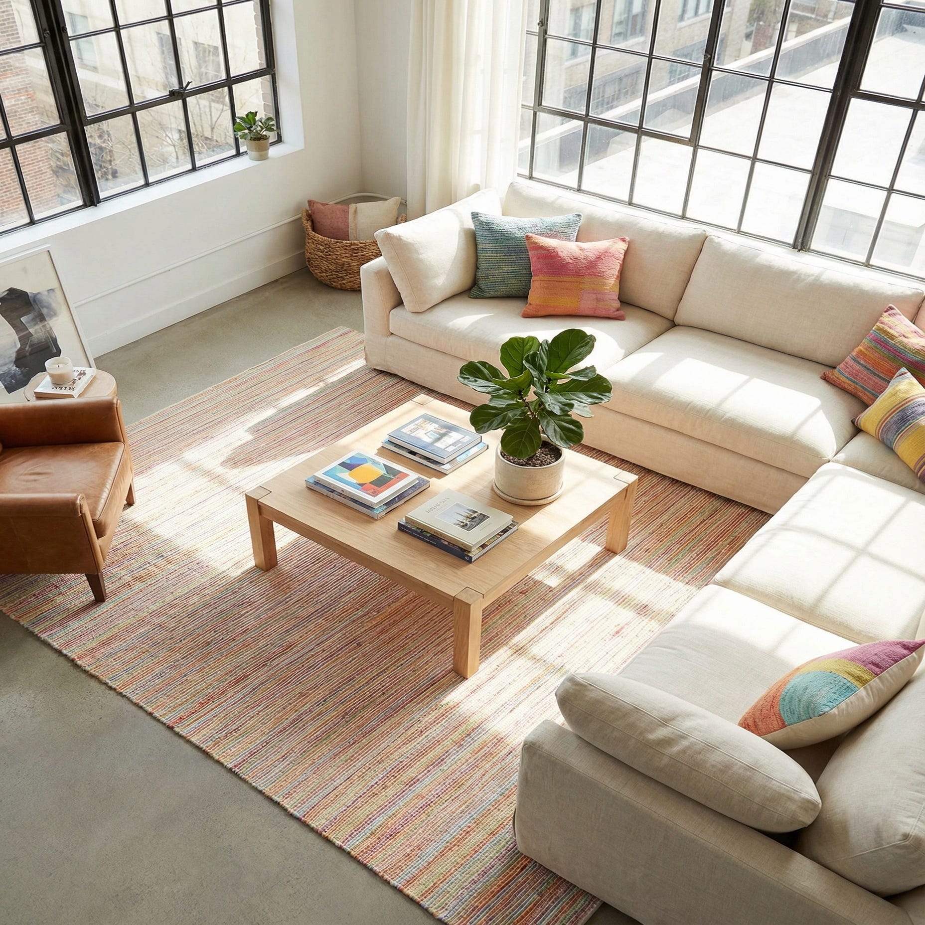 Place this rug beneath a coffee table in a casual living room to warm pale woods and linen upholstery, or use it under a dining table to introduce quiet color without competing with patterned dinnerware. It also works well in a sunroom, a child's play area, or a modern bohemian bedroom when paired with rattan accents, painted furniture, or simple mid-century silhouettes.