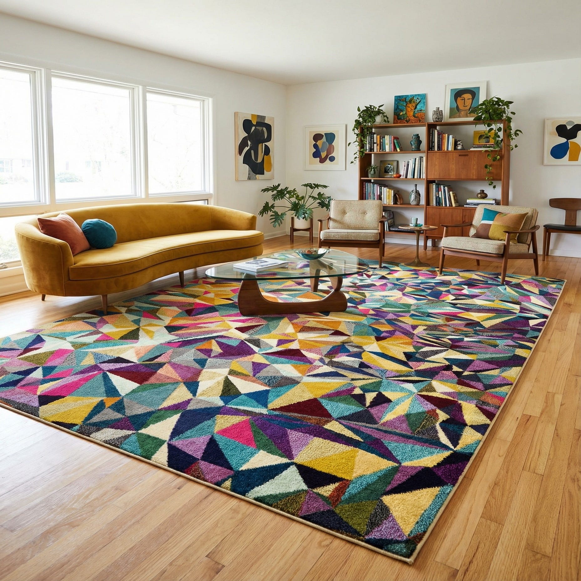 A lively geometric design of angular, faceted shards creates movement across a multi-colored ground. The pattern weaves together warm and cool tones — beige, navy, light blue, teal, burgundy, purple, puce, red, orange, yellow and pink — so each viewing angle reveals a different color relationship. The surface has a tactile presence you can feel beneath your feet, with a low-to-medium pile that gives a softly dense hand and a subtle texture that catches light across the facets.