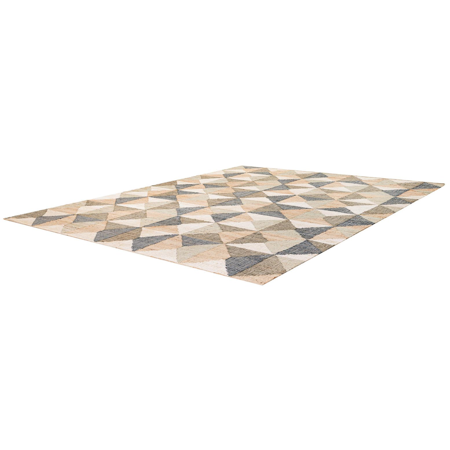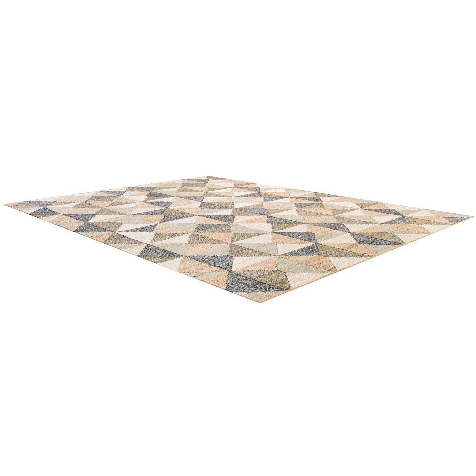 A 9x12 rectangular multi-colored modern jute rug with a geometric pattern of triangles in various natural tones.