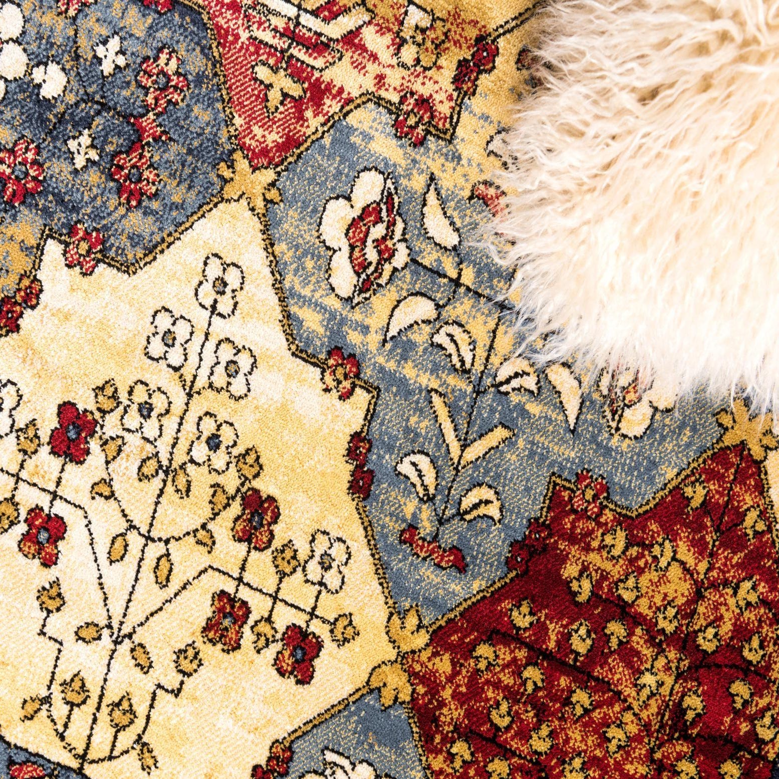 A lively patchwork of diamond and medallion motifs gives this rug a classic, handwoven look with modern clarity. The multi background carries a balanced palette of beige, ivory, blue, red and black, with small floral and vine details filling each tile and an ornate floral border framing the piece. Machine-made from 100% polypropylene, the rug has a low, dense pile with a smooth, slightly soft hand that holds the pattern clearly while providing a comfortable surface underfoot.