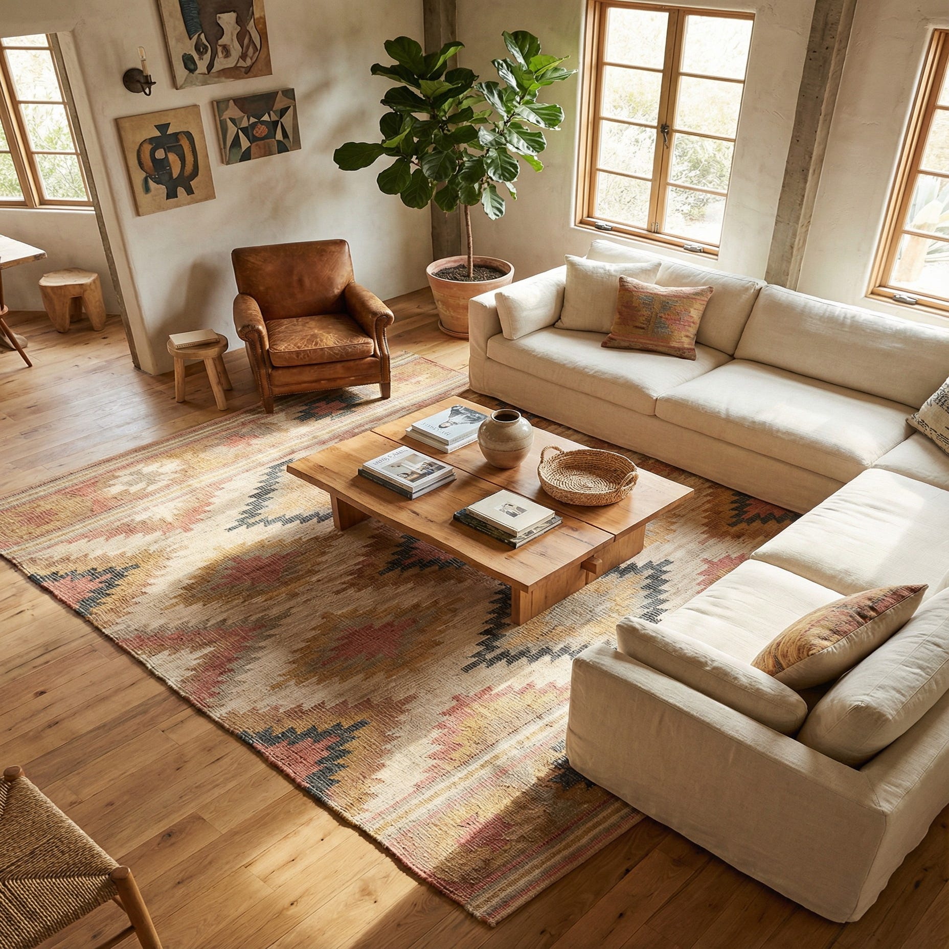 This rug would complement an array of interior designs; it would serve as an anchor piece in a bohemian setting, enhance the earthy tones in a rustic decor, or add warmth to a modern minimalist space. Its robust construction makes it suitable for high-traffic areas, while the rich color scheme can easily coordinate with both neutral and vibrant color palettes. The Kilim Jute rug is ideally placed in living rooms, dining areas, or open-concept spaces where its patterns can be fully appreciated from multiple angles.