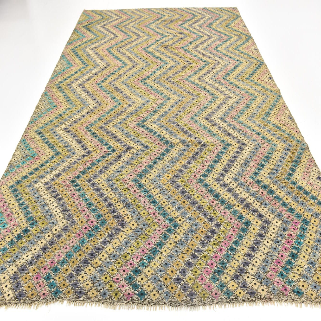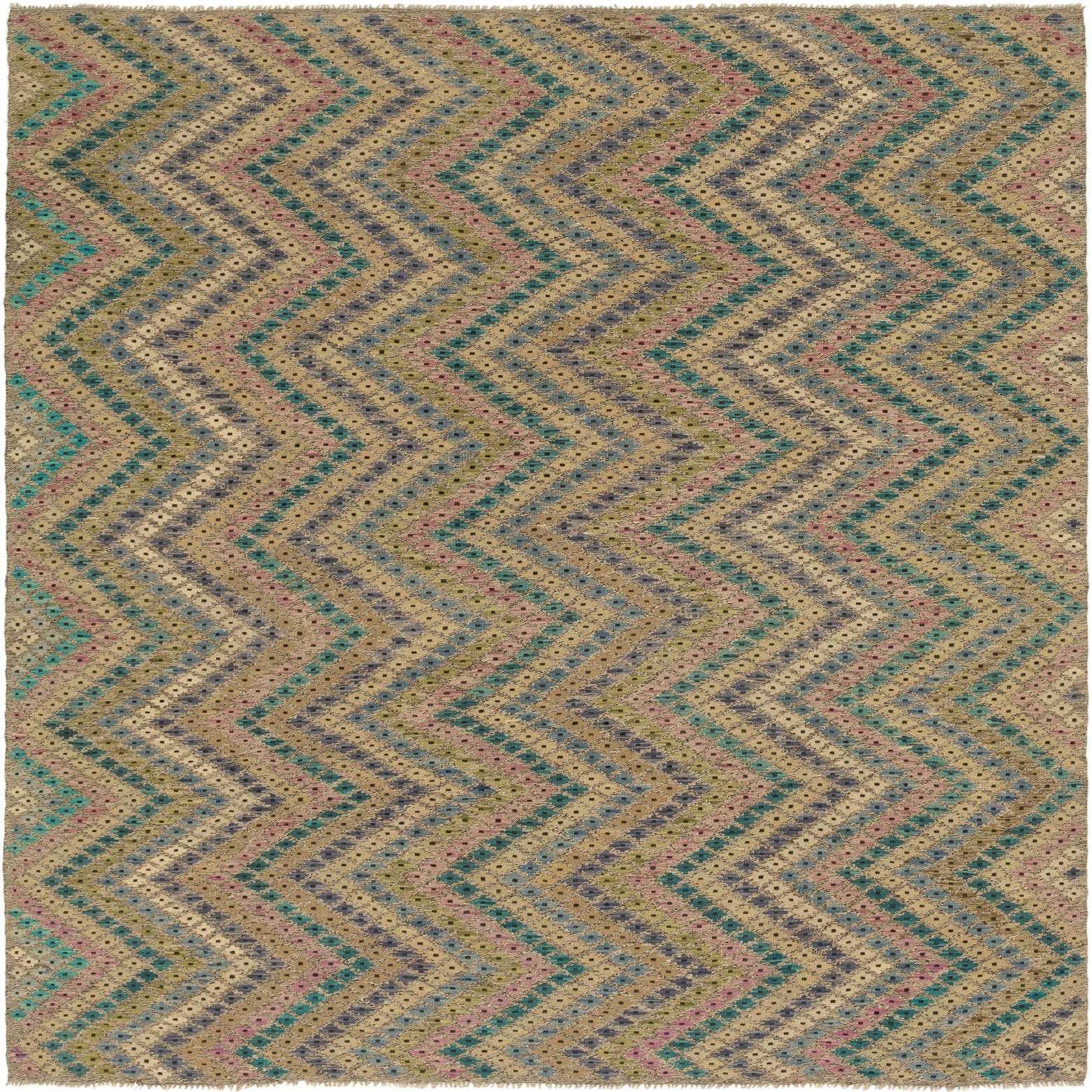 A 9x12 rectangular Kilim Modern wool rug featuring a multi-colored Southwestern zigzag pattern with teal, pink, and purple hues on a beige background.