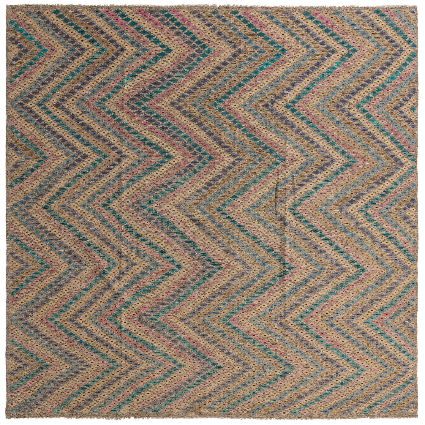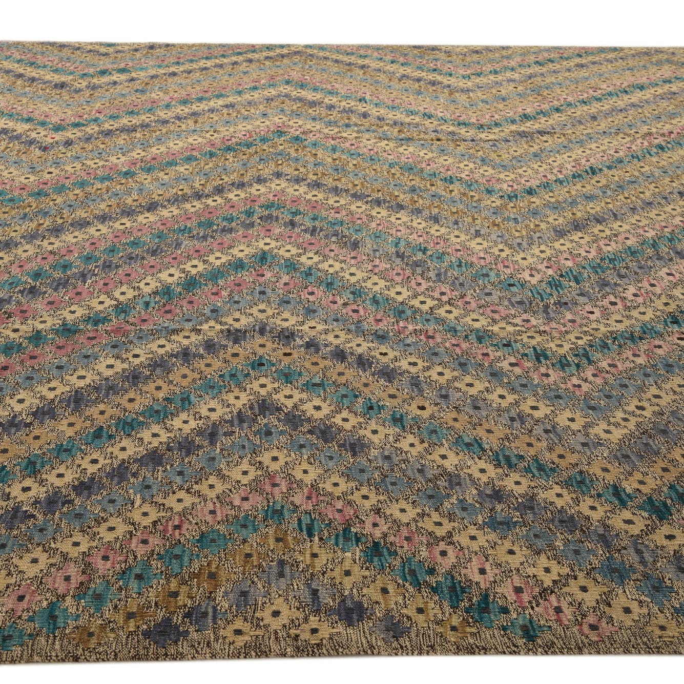 From the Kilim Modern collection, this 9x12 hand-woven rug is a dynamic addition to any space, boasting a 100% wool construction. The visual impact of this rug is characterized by a distinctive chevron pattern, presenting a modern twist on a classic design. The color palette is diverse, featuring hues of beige, blue, brown, purple, pink, teal, tan, light blue, light brown, and black set against a multi-colored background, providing versatility and depth.