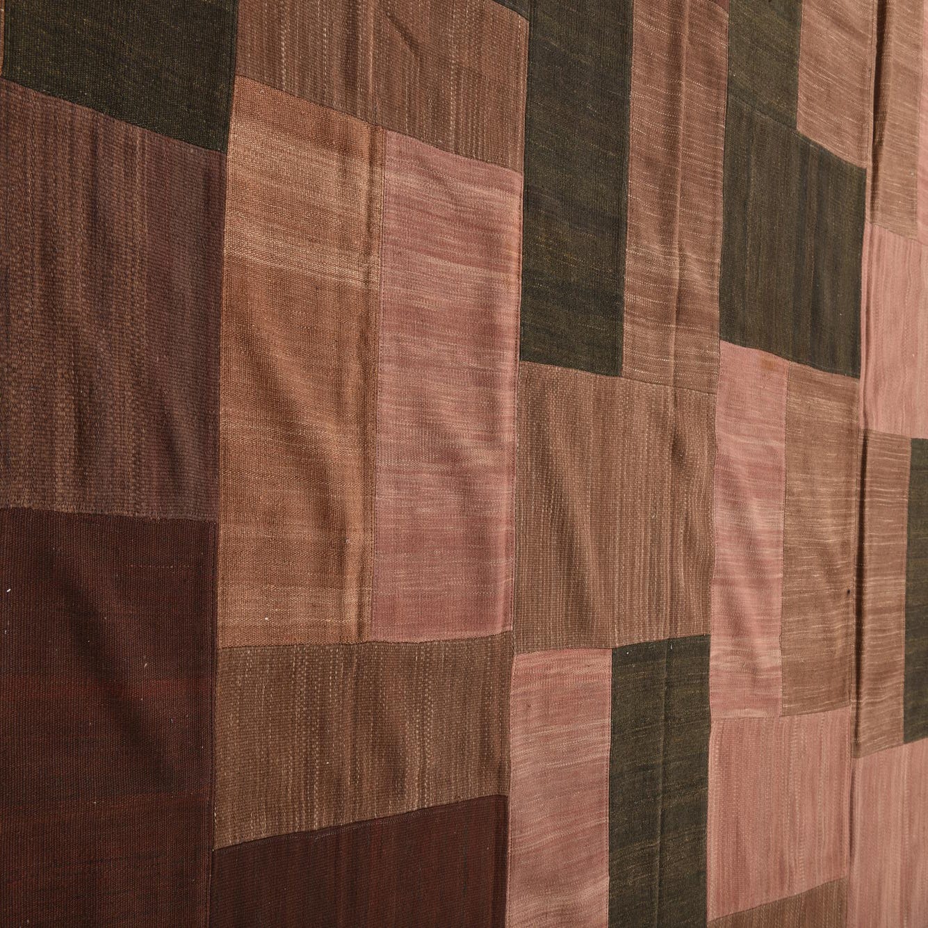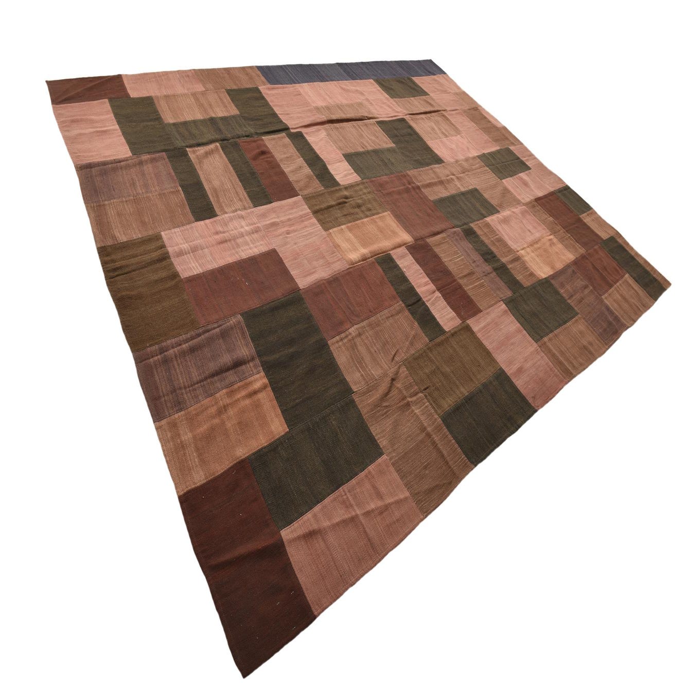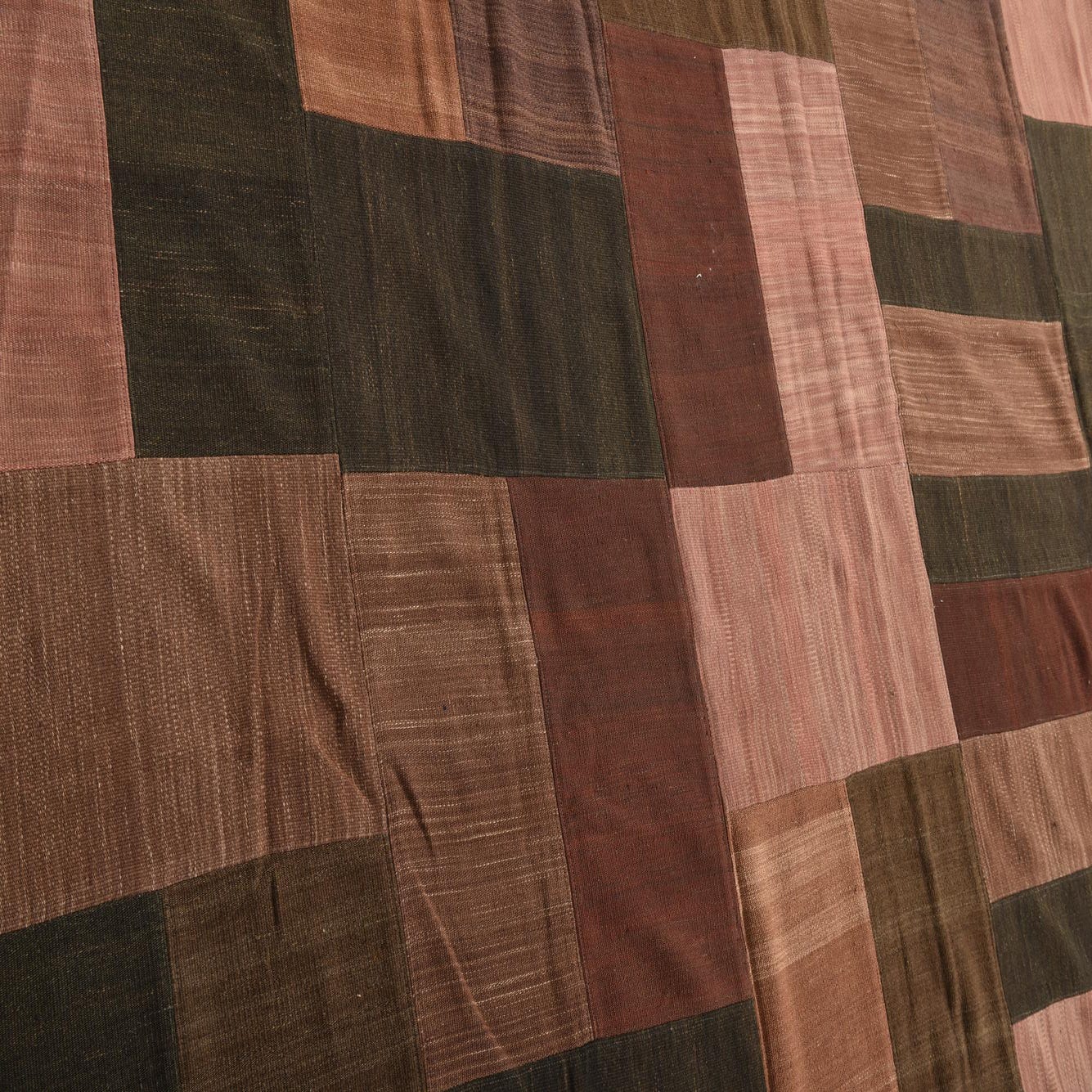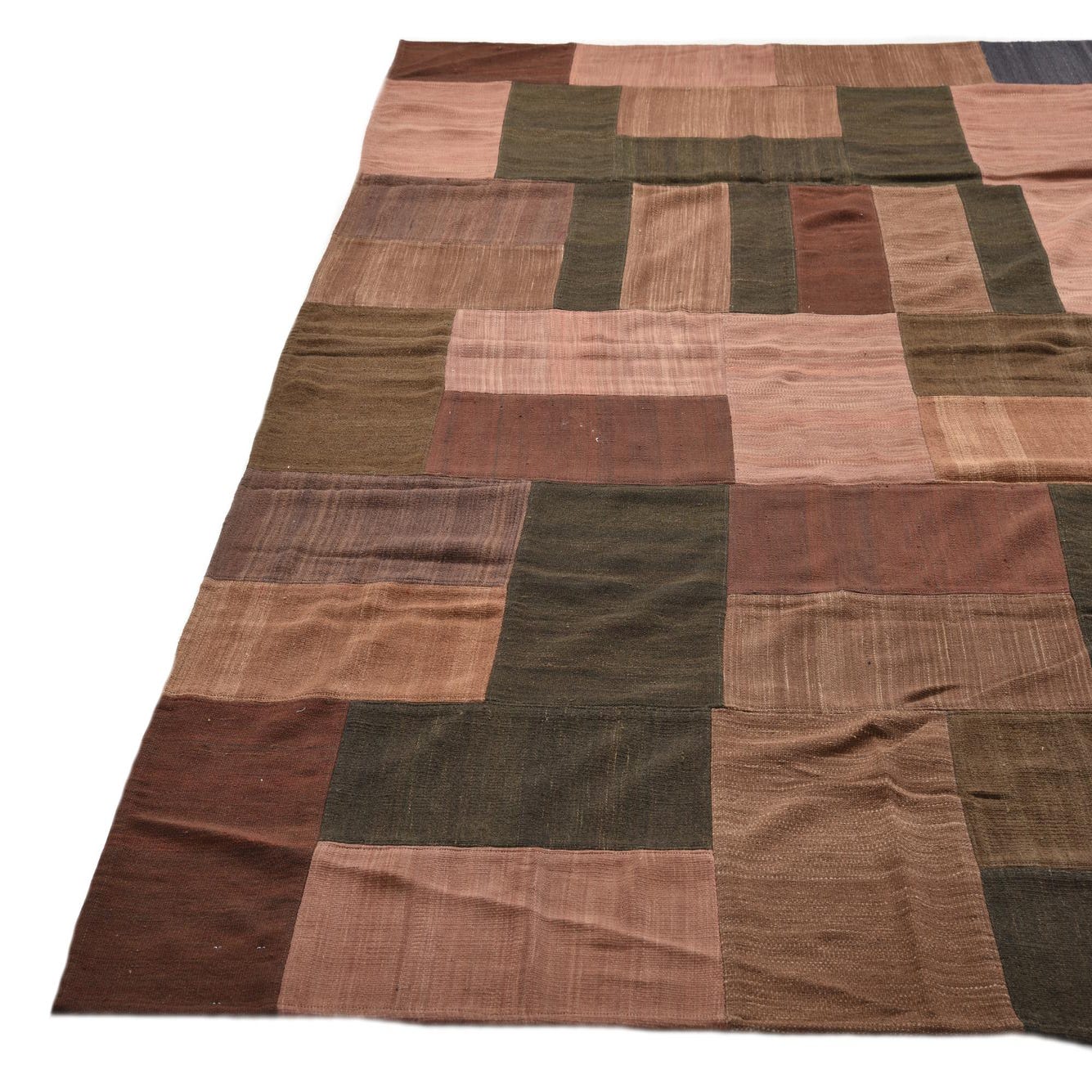 A 9x12 rectangular Kilim Patchwork rug featuring a multi-colored abstract design with various shades of brown, pink, and dark blue patches.