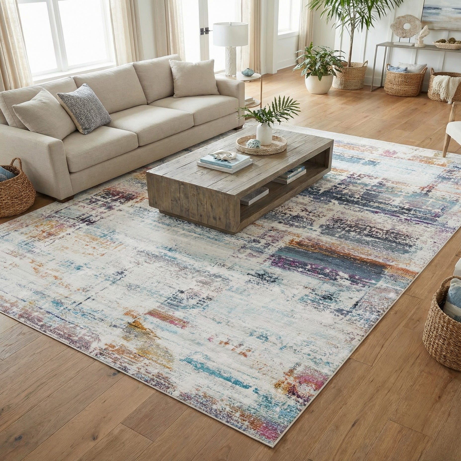 This piece works well as an anchoring layer in a living room or beneath a dining table where its blended palette can tie together neutral furnishings and brighter accents. It also fits nicely in a bedroom or home office to introduce gentle color and visual texture while keeping the overall look calm and modern. Pair it with light wood tones, cool grays, or muted brass finishes to highlight the rug’s gold and blue notes.